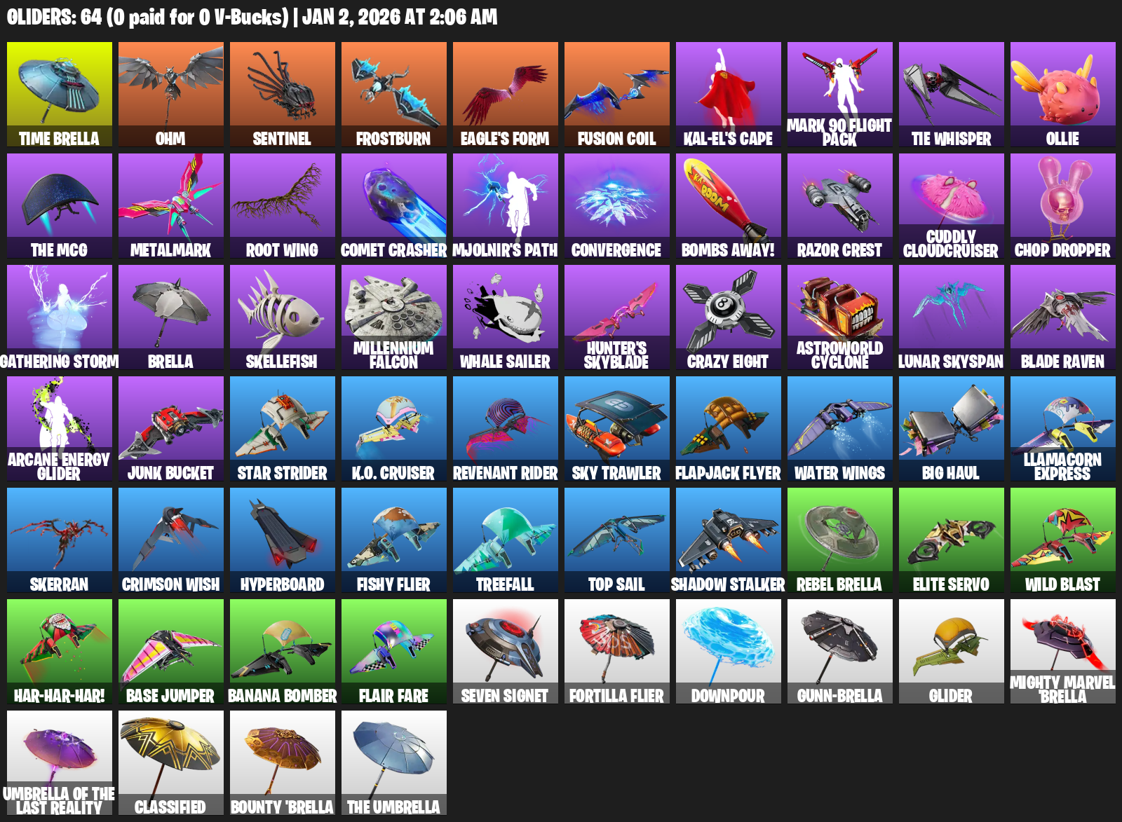 Time Brella, Ohm, Sentinel, Frostburn, Eagle’s Form, Kal-El’s Cape, TIE Whisper, Ollie, Metalmark, Root Wing, Comet Crasher, Mjolnir’s Path, Convergence, Bombs Away!, Razor Crest, Cuddly Cloudcruiser, Chop Dropper
