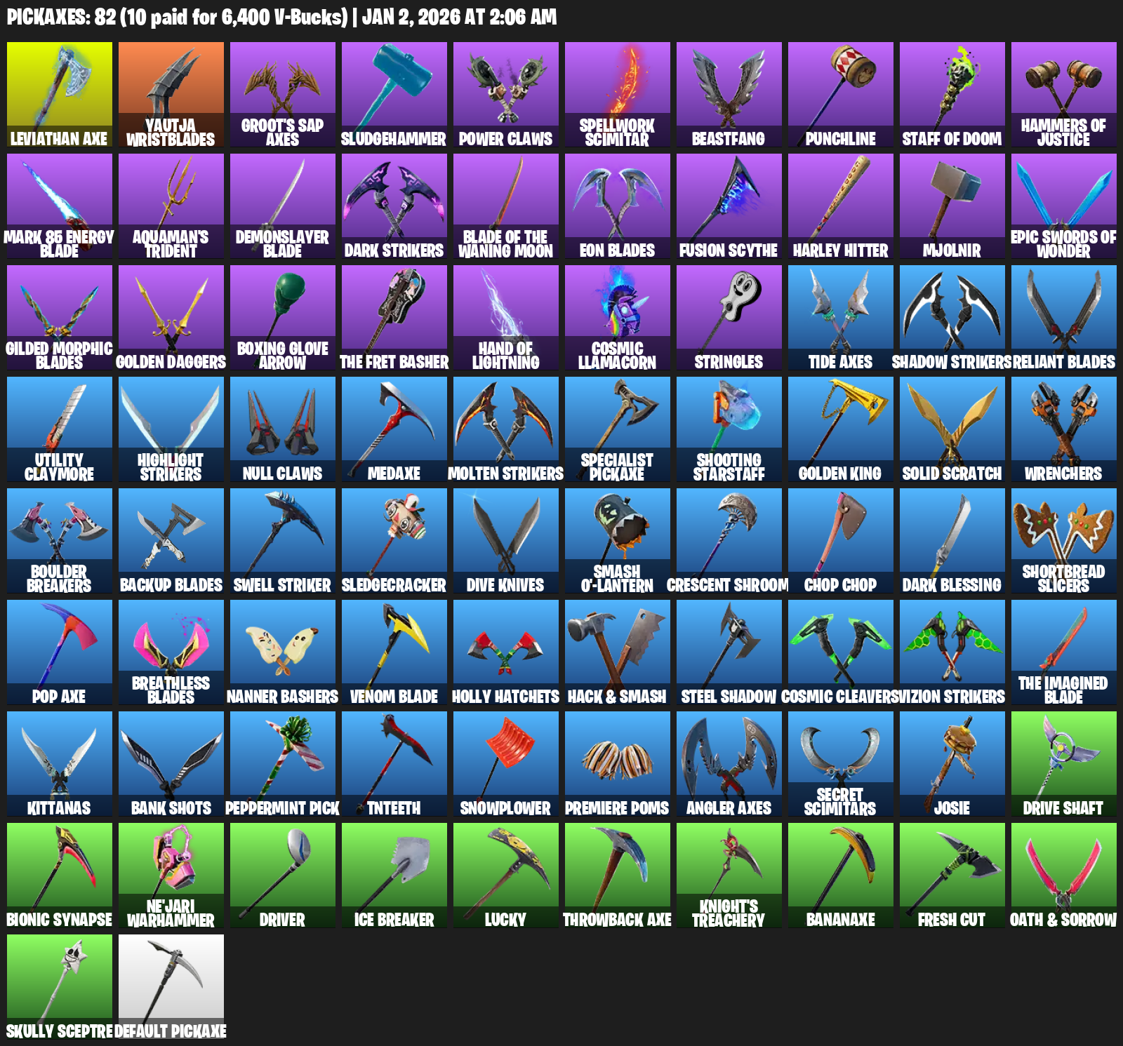 Leviathan Axe, Yautja Wristblades, Groot’s Sap Axes, Sludgehammer, Power Claws, Spellwork Scimitar, Beastfang, Punchline, Staff of Doom, Mark 85 Energy Blade, Aquaman’s Trident, Dark Strikers, Eon Blades, Harley Hitter, Mjolnir