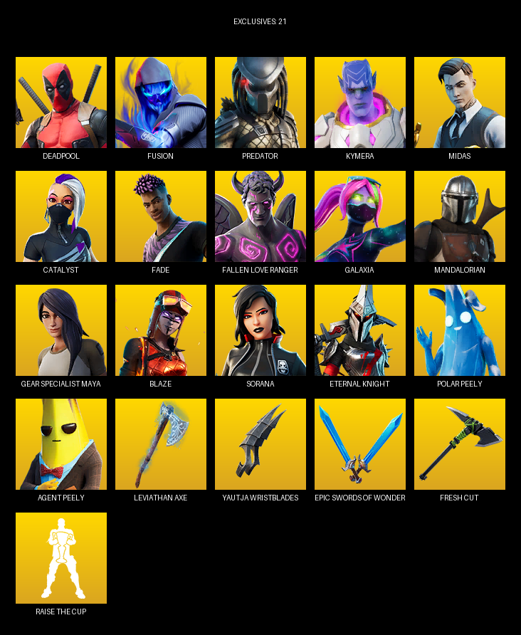 Gear Specialist Maya, Deadpool, Fusion, Predator, Kymera, Midas, Catalyst, Fade, Fallen Love Ranger, Galaxia, Mandalorian, Blaze, Sorana, Eternal Knight, Meowscles, Scuba Jonesy, Polar Peely, 8-Ball vs Scratch, Omni-Man, Jules