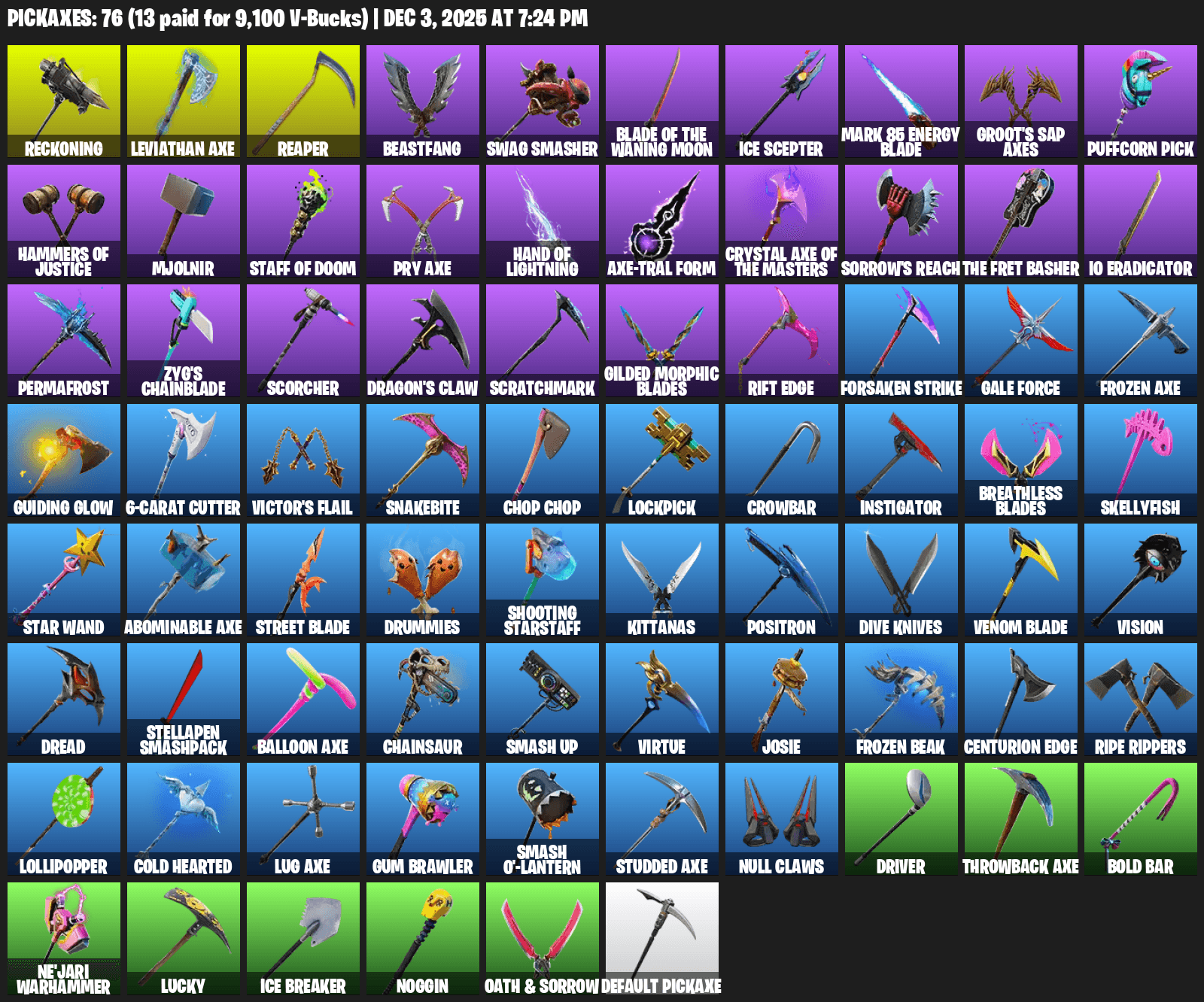 Leviathan Axe, Reckoning, Reaper, Beastfang, Swag Smasher, Ice Scepter, Mark 85 Energy Blade, Groot’s Sap Axes, Puffcorn Pick, Hammers of Justice, Mjolnir, Sorrow’s Reach, IO Eradicator