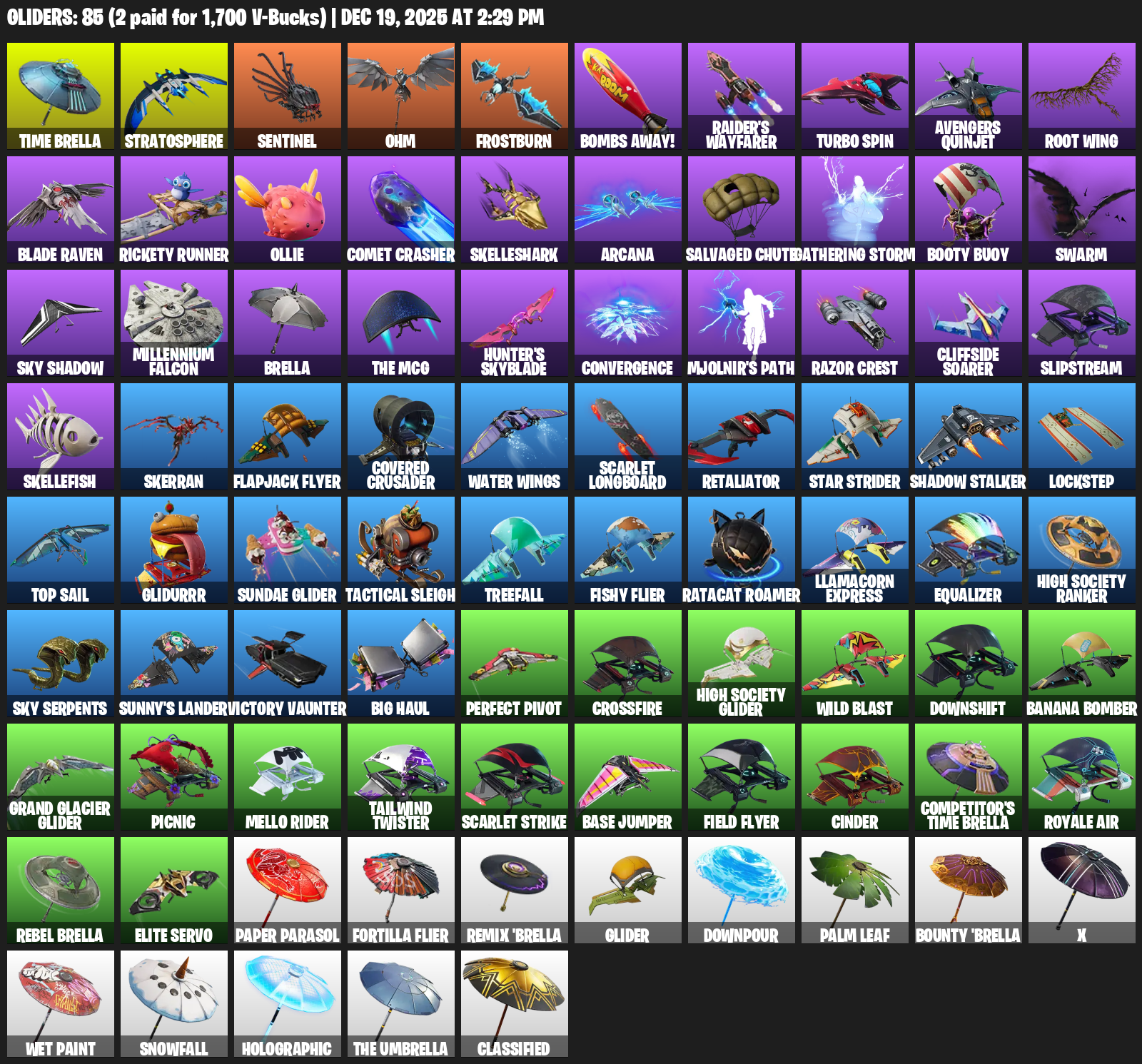 Time Brella, Stratosphere, Ohm, Frostburn, Bombs Away!, Raider’s Wayfarer, Turbo Spin, Avengers Quinjet, Root Wing, Blade Raven, Rickety Runner, Ollie, Comet Crasher, Skelleshark, Arcana, Salvaged Chute, Gathering Storm, Booty Buoy, Swarm