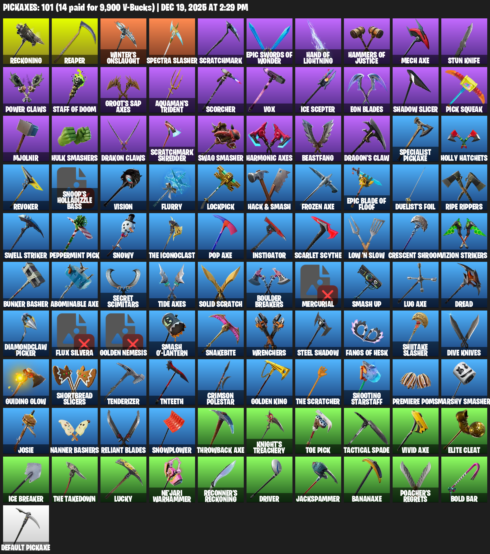 Reckoning, Reaper, Winter’s Onslaught, Spectra Slasher, Scratchmark, Hand of Lightning, Mech Axe, Stun Knife, Power Claws, Groot’s Sap Axes, Aquaman’s Trident, Scorcher, Vox, Ice Scepter, Eon Blades, Shadow Slicer, Pick Squeak