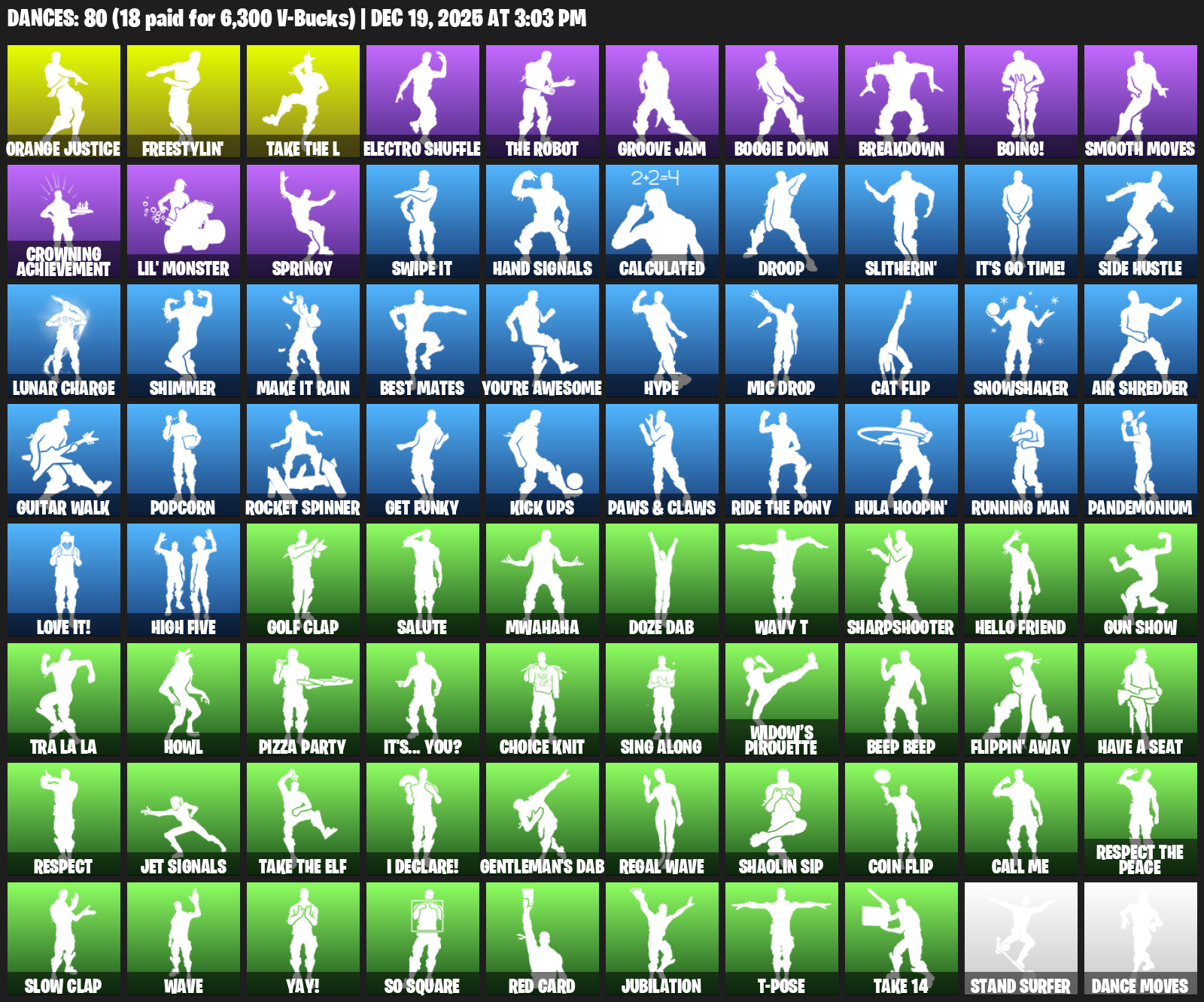 Orange Justice, Freestylin’, Electro Shuffle, Groove Jam, Boogie Down, Breakdown, Boing!, Smooth Moves, Crowning Achievement, Lil’ Monster, Springy, Swipe It, Hand Signals, Calculated, Droop, Slitherin’, It’s Go Time!, Side Hustle