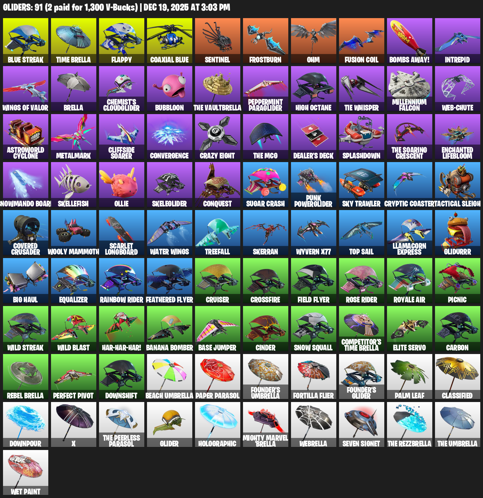 Time Brella, Flappy, Sentinel, Frostburn, Ohm, Bombs Away!, Intrepid, Chemist’s Cloudglider, Bubbloon, Peppermint Paraglider, High Octane, TIE Whisper, Millennium Falcon