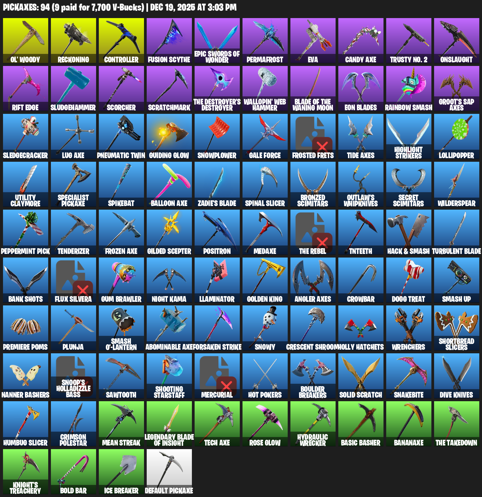 Ol’ Woody, Reckoning, Controller, Fusion Scythe, Permafrost, EVA, Candy Axe, Trusty No. 2, Onslaught, Rift Edge, Sludgehammer, Scorcher, Scratchmark, Wallopin’ Web Hammer, Eon Blades, Rainbow Smash, Groot’s Sap Axes