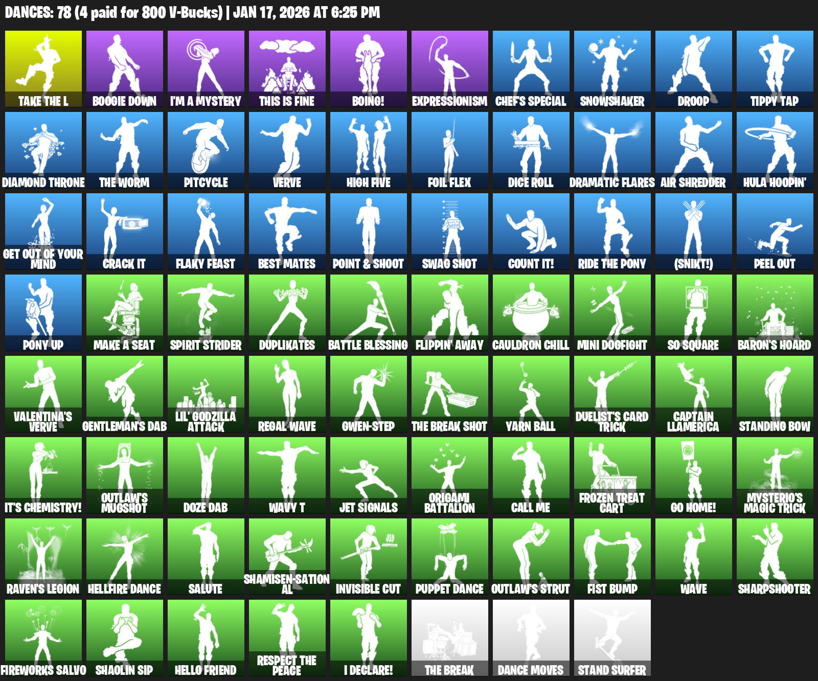 Boogie Down, I’m a Mystery, This is Fine, Boing!, Expressionism, Chef’s Special, Snowshaker, Droop, Tippy Tap, Diamond Throne, Pitcycle, Verve, High Five, Foil Flex, Dice Roll, Dramatic Flares, Air Shredder, Hula Hoopin’
