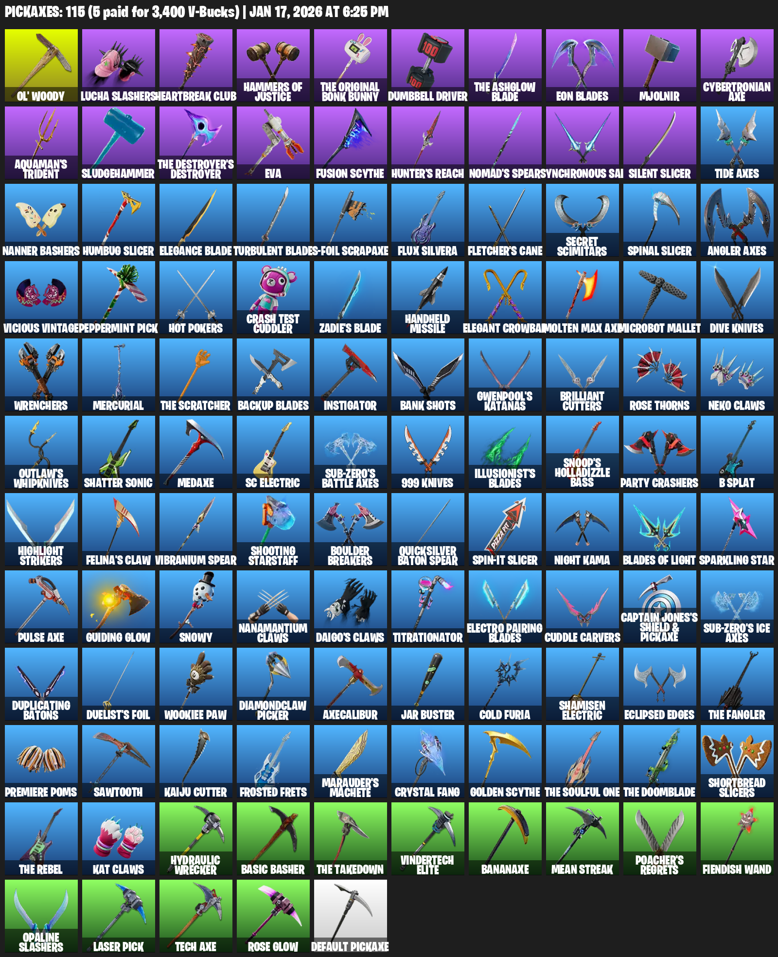 Ol’ Woody, Lucha Slashers, Heartbreak Club, Hammers of Justice, Dumbbell Driver, Eon Blades, Mjolnir, Cybertronian Axe, Aquaman’s Trident, Sludgehammer, EVA, Hunter’s Reach, Nomad’s Spear, Synchronous Sai, Silent Slicer, Tide Axes