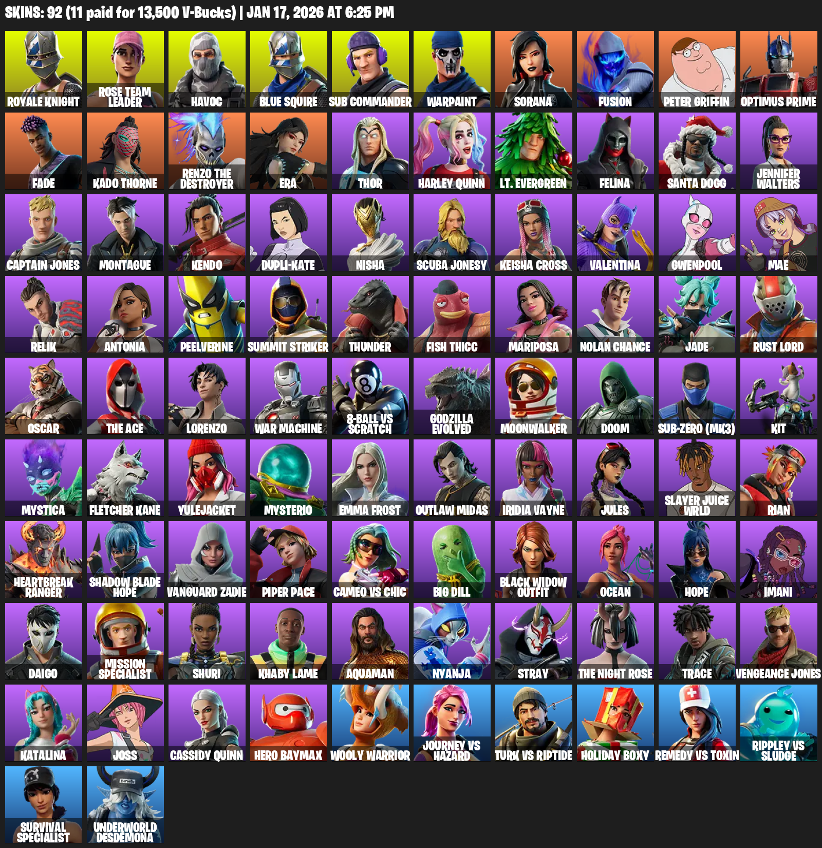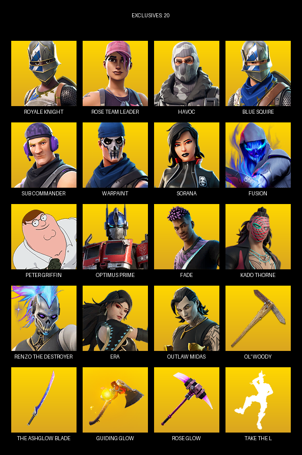 Royale Knight, Blue Squire, Rose Team Leader, Havoc, Sub Commander, Warpaint, Sorana, Fusion, Peter Griffin, Optimus Prime, Fade, Kado Thorne, Renzo the Destroyer, Era, Thor, Harley Quinn, Lt. Evergreen, Felina, Santa Dogg, Jennifer Walters