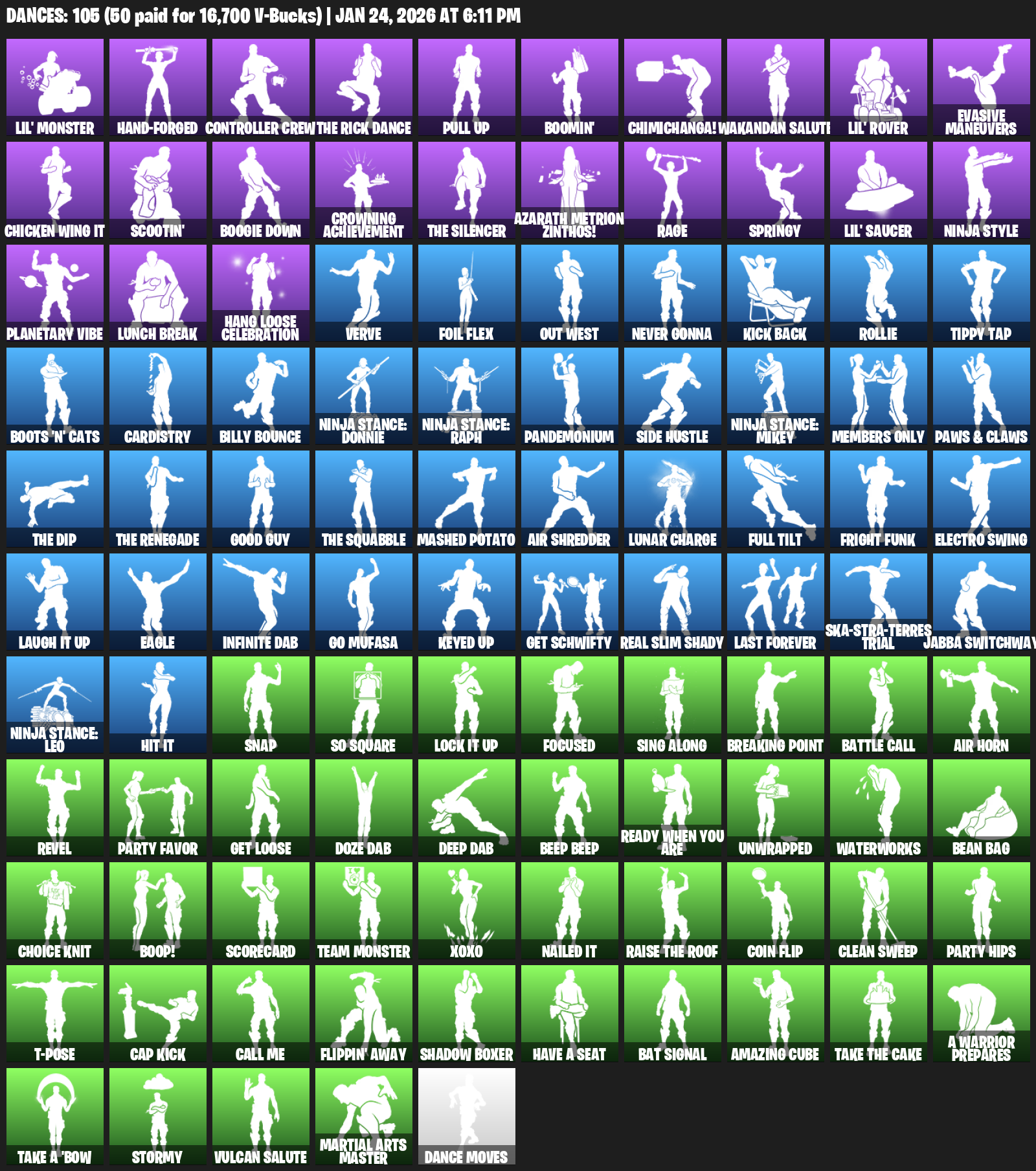 Lil’ Monster, Controller Crew, Pull Up, Boomin’, Chimichanga!, Wakandan Salute, Evasive Maneuvers, Chicken Wing It, Scootin’, Boogie Down, Crowning Achievement, Azarath Metrion Zinthos!, Rage, Springy, Ninja Style