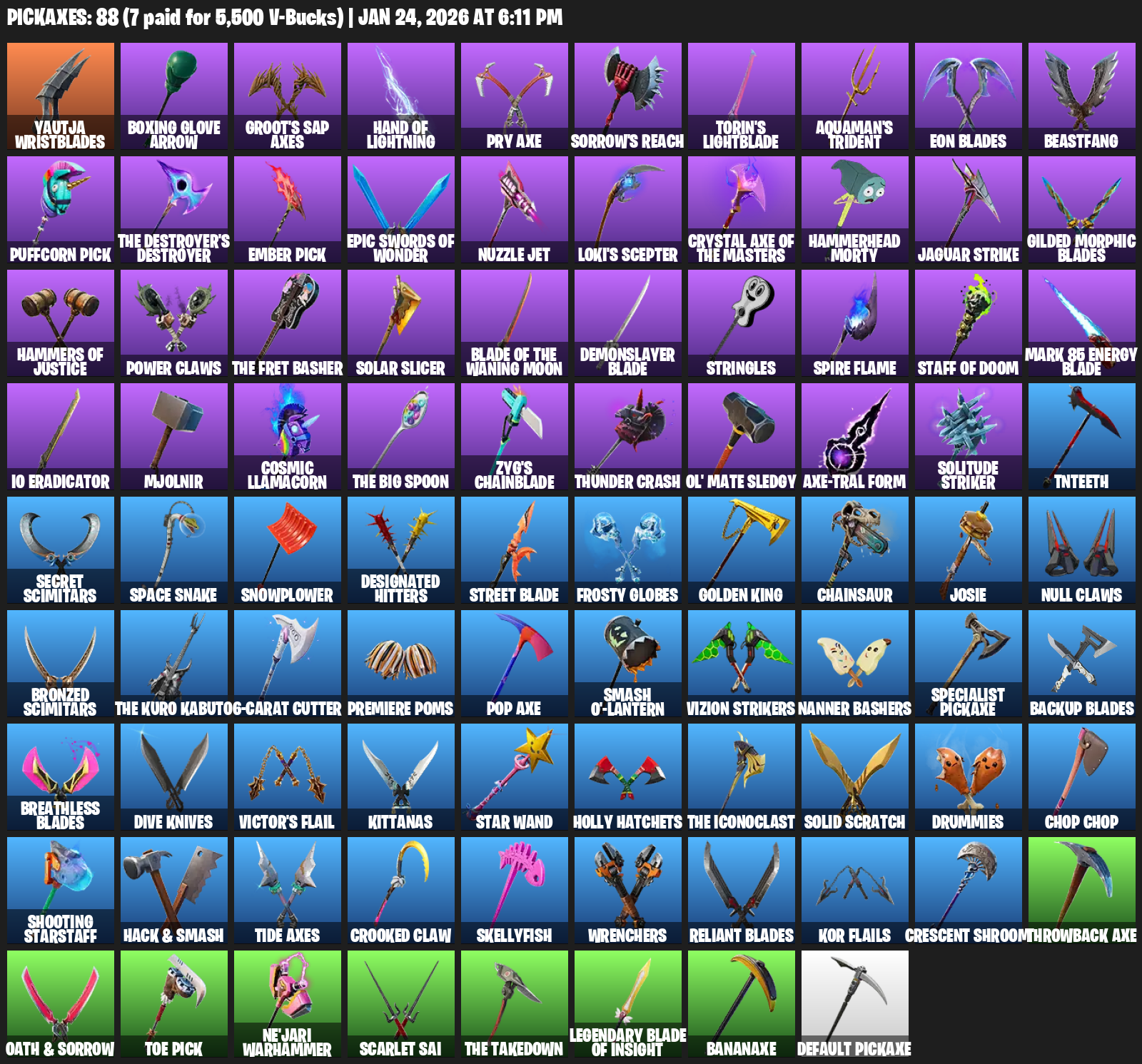 Yautja Wristblades, Boxing Glove Arrow, Groot’s Sap Axes, Hand of Lightning, Pry Axe, Sorrow’s Reach, Torin’s Lightblade, Aquaman’s Trident, Eon Blades, Beastfang, Puffcorn Pick, The Destroyer’s Destroyer, Nuzzle Jet, Loki’s Scepter, Hammerhead Morty, Jaguar Strike