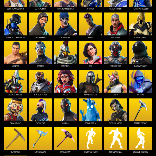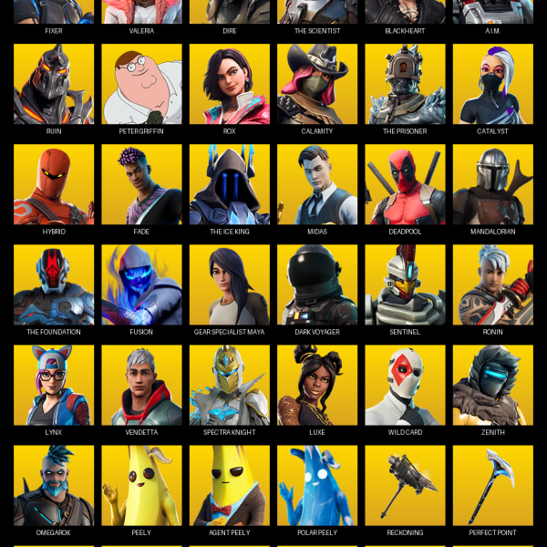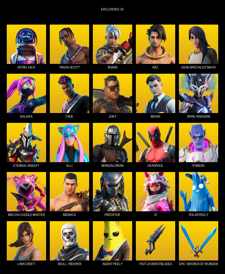 Travis Scott, Gear Specialist Maya, Lara Croft, Astro Jack, Ronin, Raz, Galaxia, Fade, Joey, Midas, Spire Assassin, Eternal Knight, Alli, Mandalorian, Deadpool, Kymera, Mecha Cuddle Master, Menace, Predator, Vi