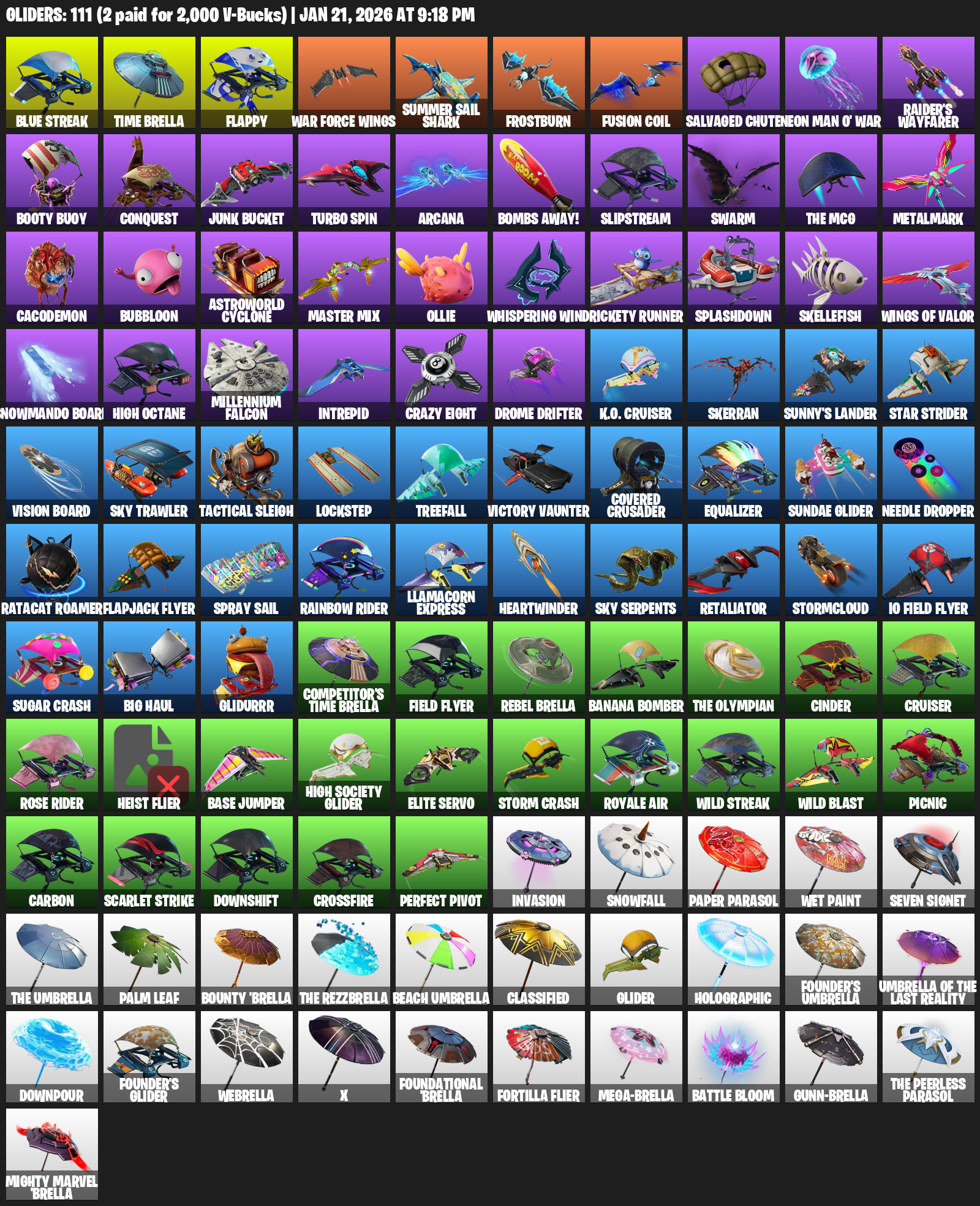 Time Brella, Flappy, War Force Wings, Summer Sail Shark, Frostburn, Salvaged Chute, Raider’s Wayfarer, Booty Buoy, Conquest, Junk Bucket, Turbo Spin, Arcana, Bombs Away!, Slipstream, Swarm, Metalmark