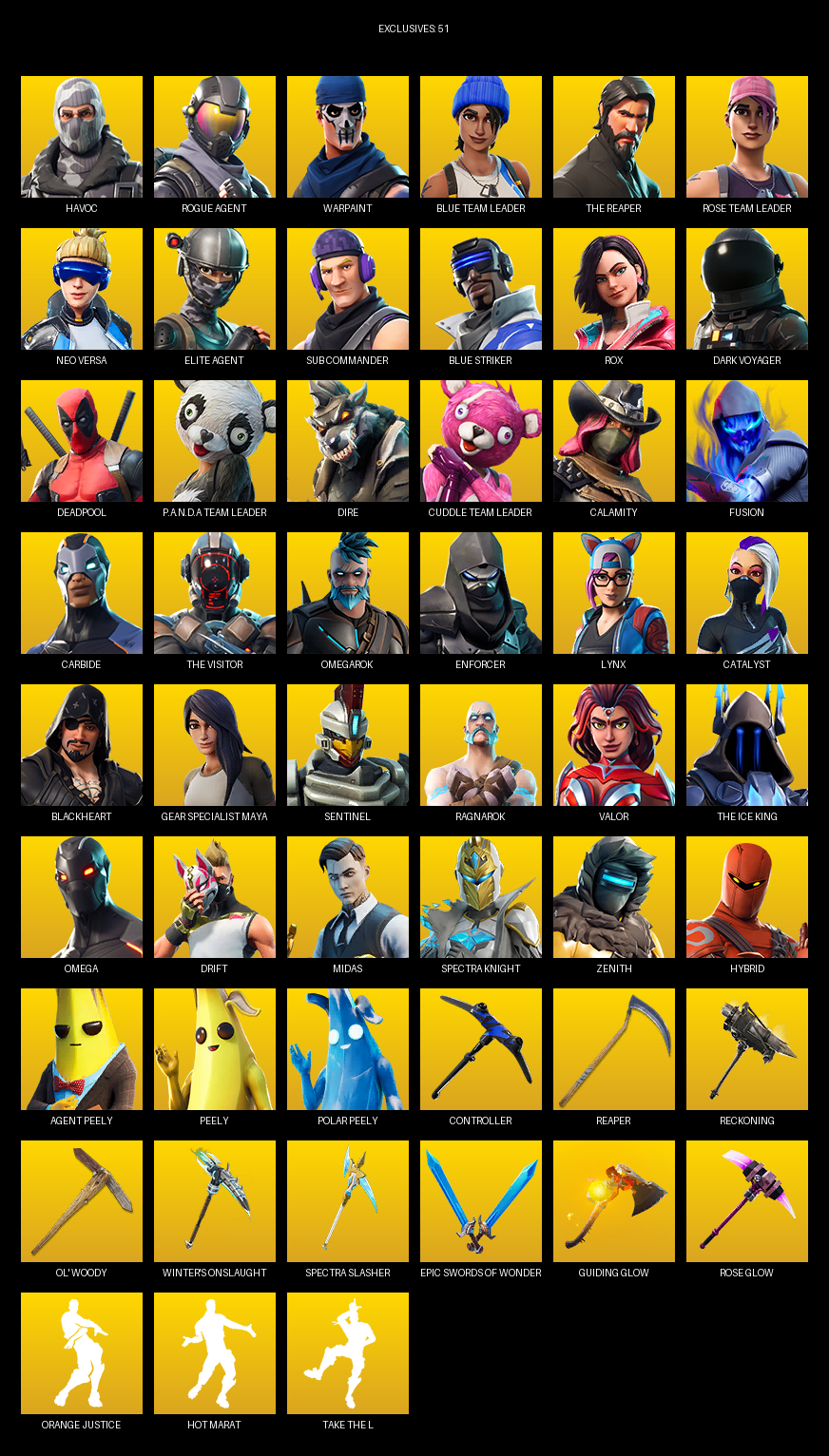 The Reaper, Elite Agent, Gear Specialist Maya, Omega, Havoc, Warpaint, Blue Team Leader, Neo Versa, Sub Commander, Rox, Dark Voyager, Deadpool, Dire, Calamity, Fusion