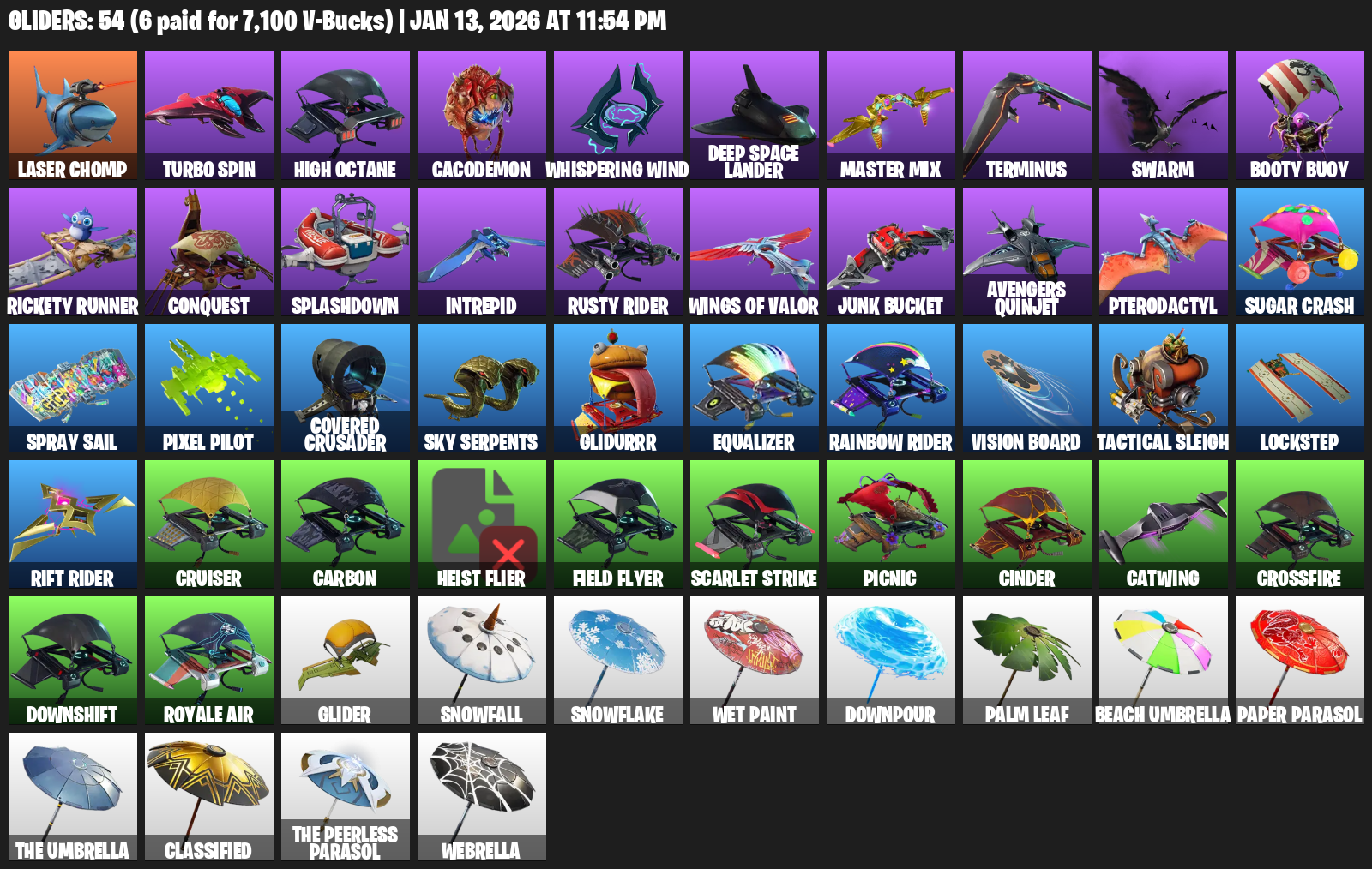 Laser Chomp, Turbo Spin, High Octane, Cacodemon, Whispering Wind, Deep Space Lander, Terminus, Swarm, Booty Buoy, Rickety Runner, Conquest, Splashdown, Intrepid, Rusty Rider, Wings of Valor, Junk Bucket, Avengers Quinjet, Pterodactyl, Sugar Crash