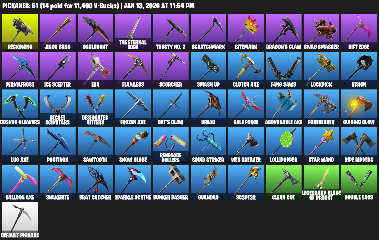 Reckoning, Jingu Bang, Onslaught, Trusty No. 2, Scratchmark, Bitemark, Dragon’s Claw, Swag Smasher, Rift Edge, Permafrost, Ice Scepter, EVA, Flawless, Scorcher, Smash Up, Clutch Axe, Fang Saws, Lockpick, Vision