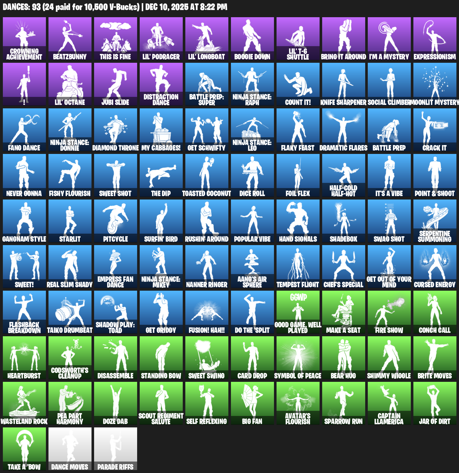 Crowning Achievement, BeatzBunny, This is Fine, Lil’ Podracer, Boogie Down, Bring it around, I’m a Mystery, Expressionism, !, Jubi Slide, Distraction Dance, Ninja Stance: Raph, Count It!, Knife Sharpener, Social Climber