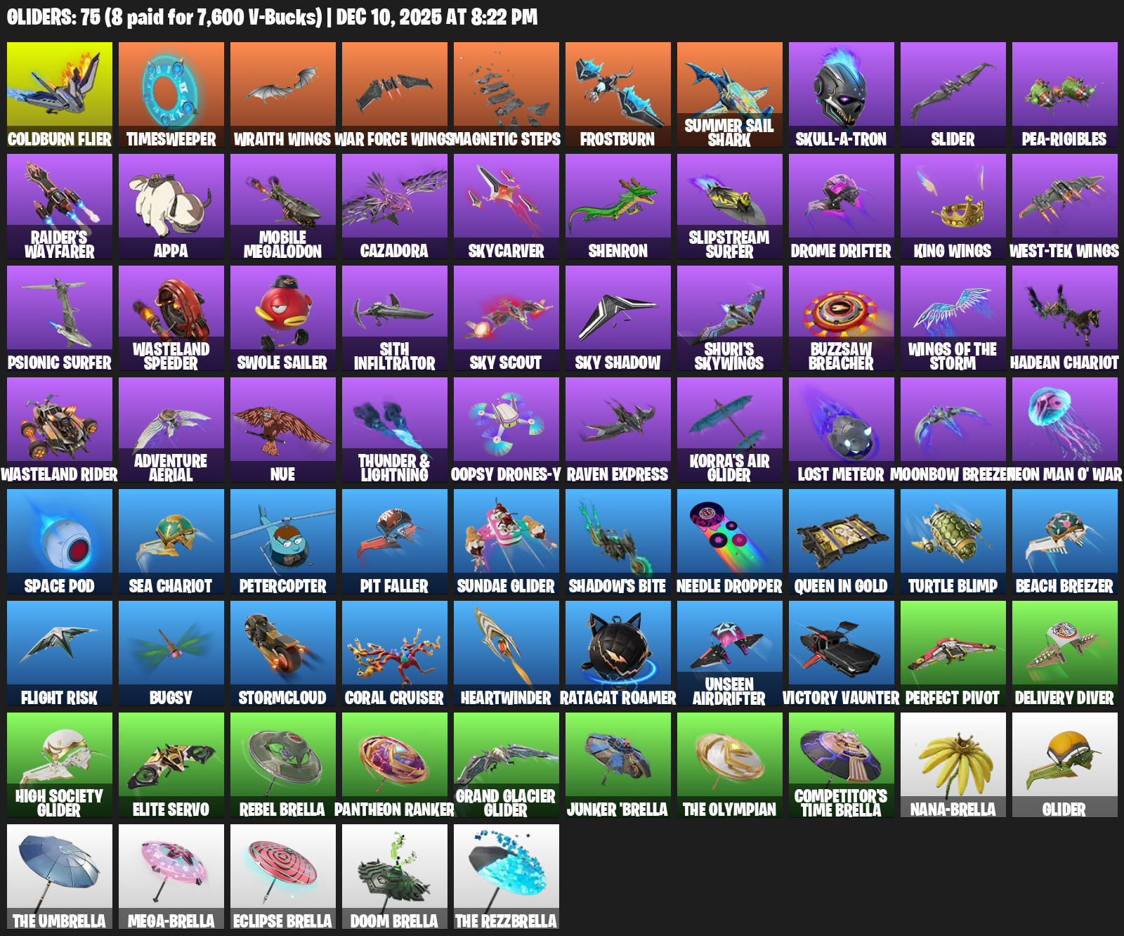 Coldburn Flier, Timesweeper, Wraith Wings, Magnetic Steps, Frostburn, Summer Sail Shark, Slider, Pea-rigibles, Raider’s Wayfarer, Appa, Mobile Megalodon, Cazadora, Skycarver, Shenron, Slipstream Surfer, Drome Drifter
