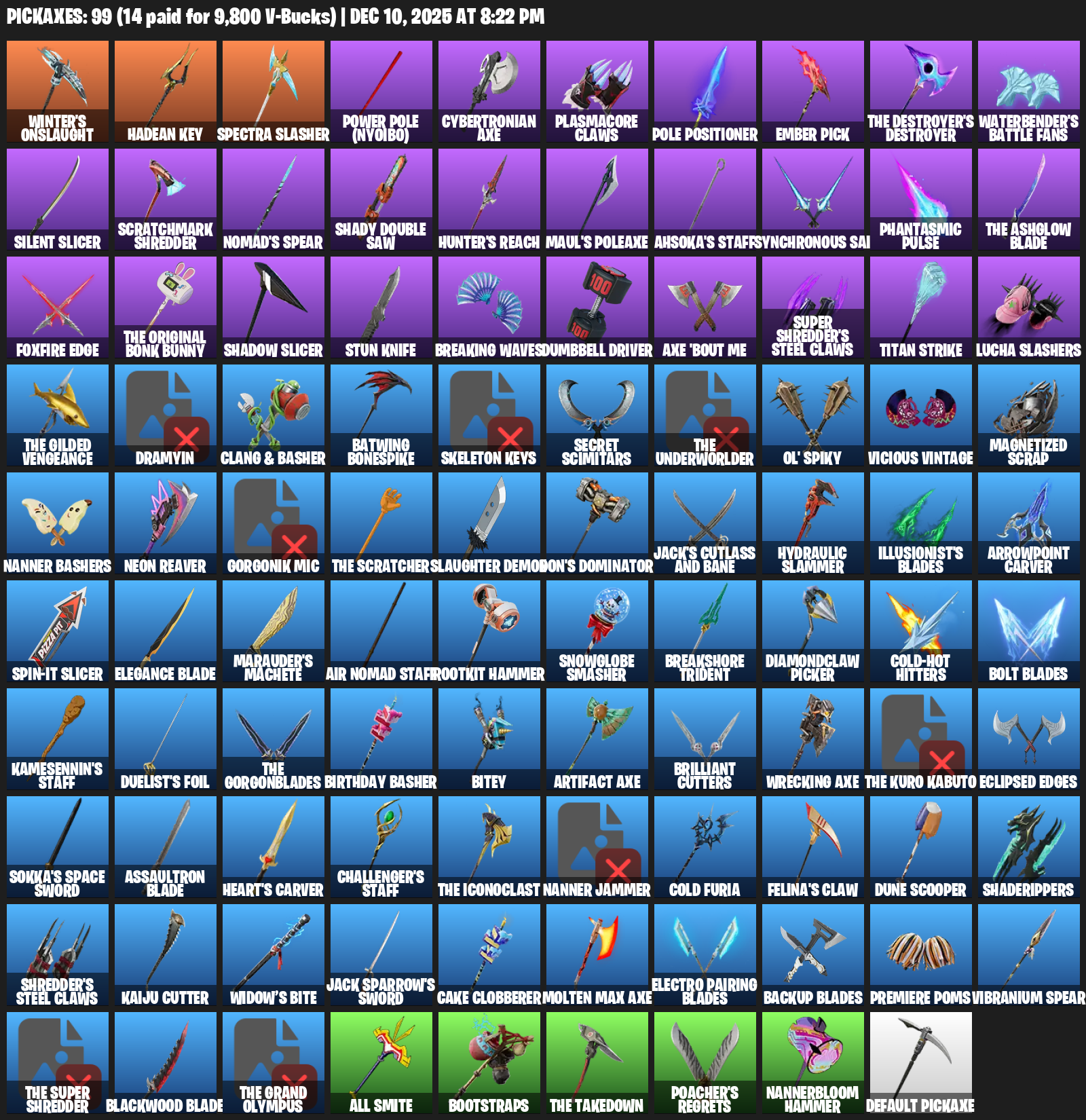 Winter’s Onslaught, Hadean Key, Power Pole (Nyoibo), Cybertronian Axe, Plasmacore Claws, Ember Pick, Waterbender’s Battle Fans, Silent Slicer, Scratchmark Shredder, Nomad’s Spear, Shady Double Saw, Hunter’s Reach, Maul’s Poleaxe, Ahsoka’s Staff, Synchronous Sai, Phantasmic Pulse