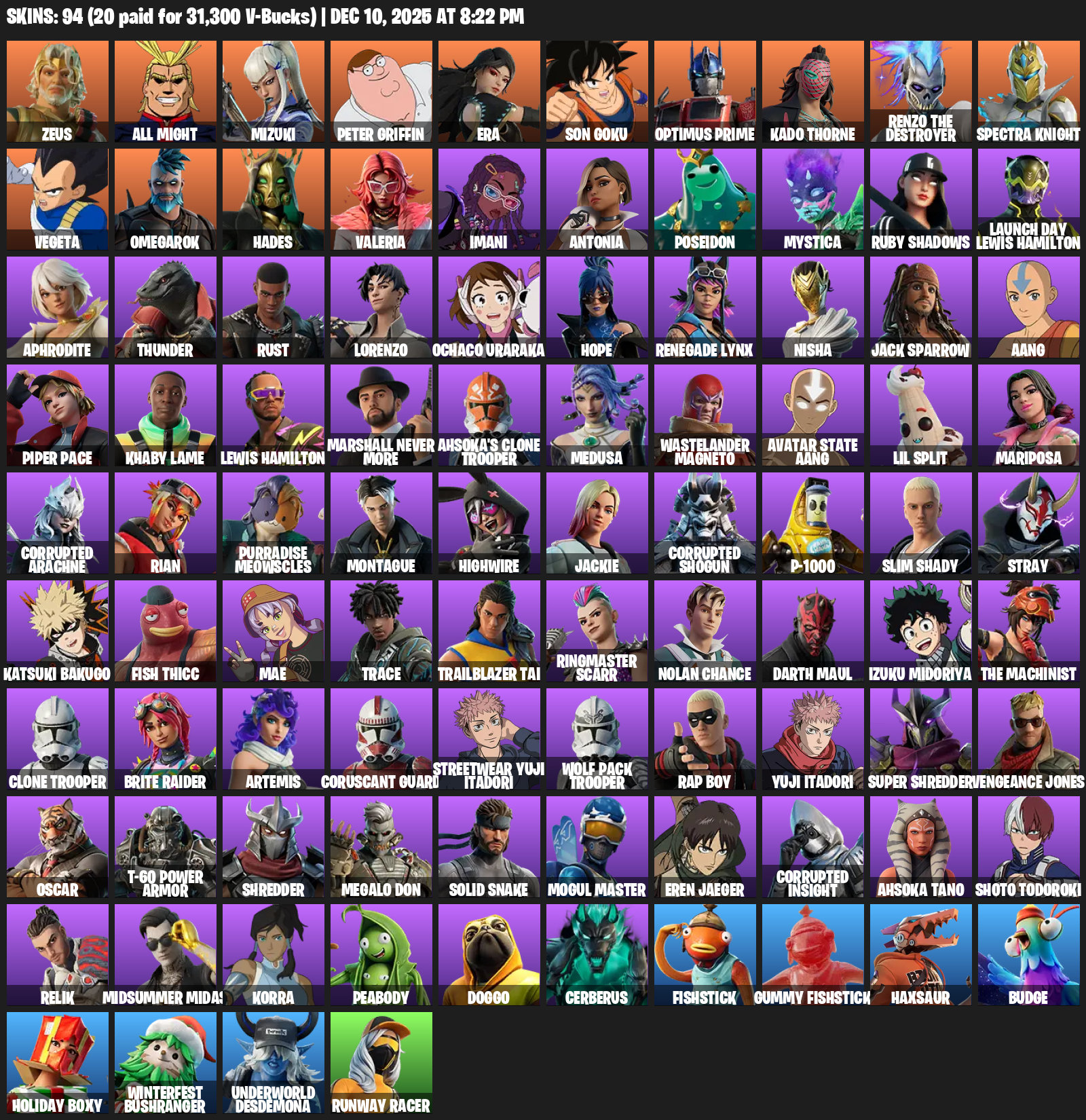 [PC/PSN/XBOX] | 94 skins | Zeus | All Might | Mizuki | Peter Griffin | Era | Son Goku | Optimus Prime | Kado Thorne | Renzo the Destroyer | #SAH7399