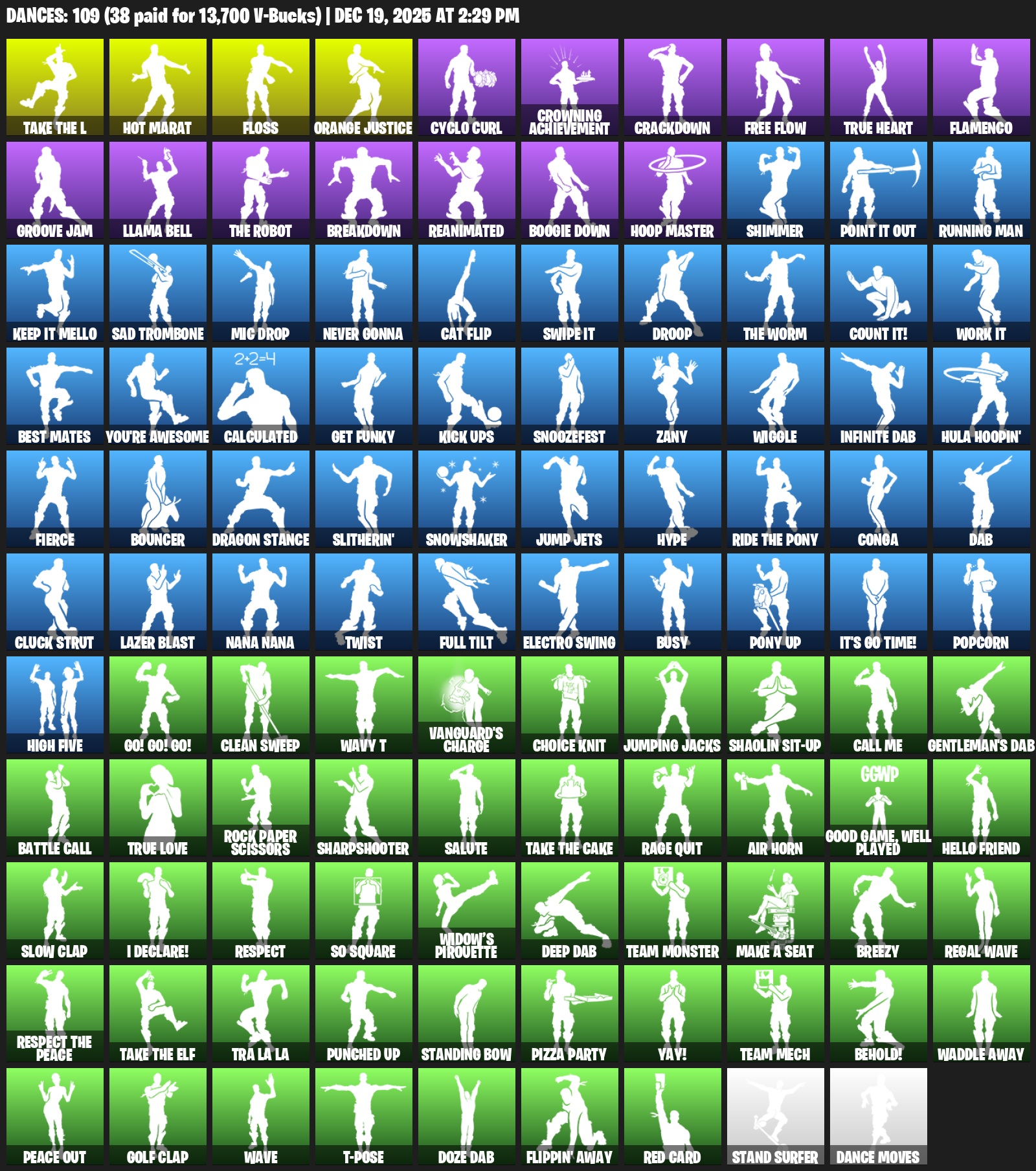Hot Marat, Floss, Orange Justice, Cyclo Curl, Crowning Achievement, Crackdown, Free Flow, True Heart, Flamenco, Groove Jam, Llama Bell, Breakdown, Reanimated, Boogie Down, Hoop Master, Shimmer, Running Man