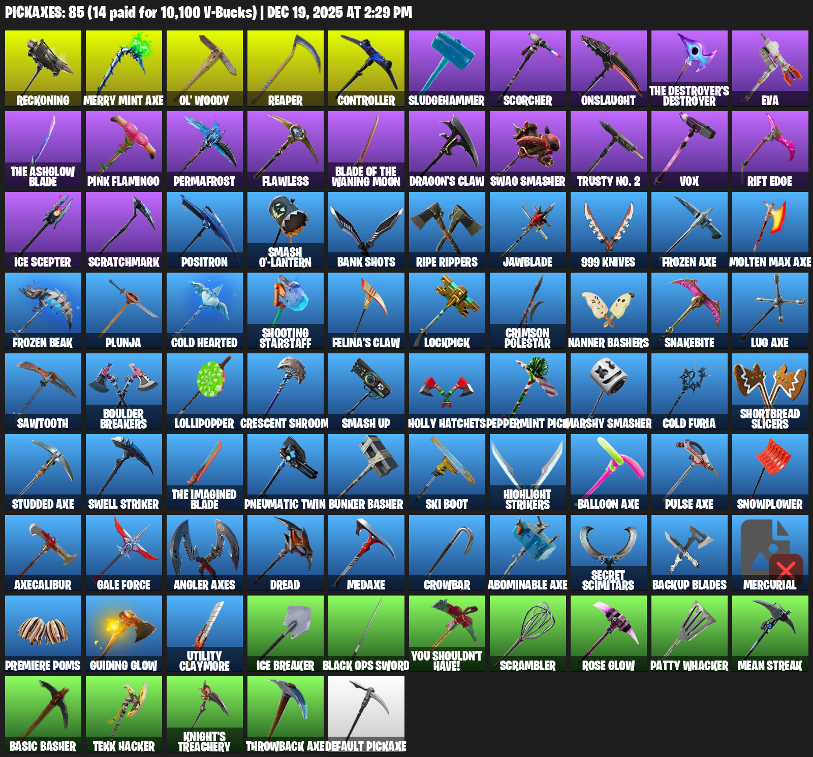 Merry Mint Axe, Reckoning, Ol’ Woody, Controller, Sludgehammer, Scorcher, Onslaught, EVA, Pink Flamingo, Permafrost, Flawless, Dragon’s Claw, Swag Smasher, Trusty No. 2, Vox, Rift Edge