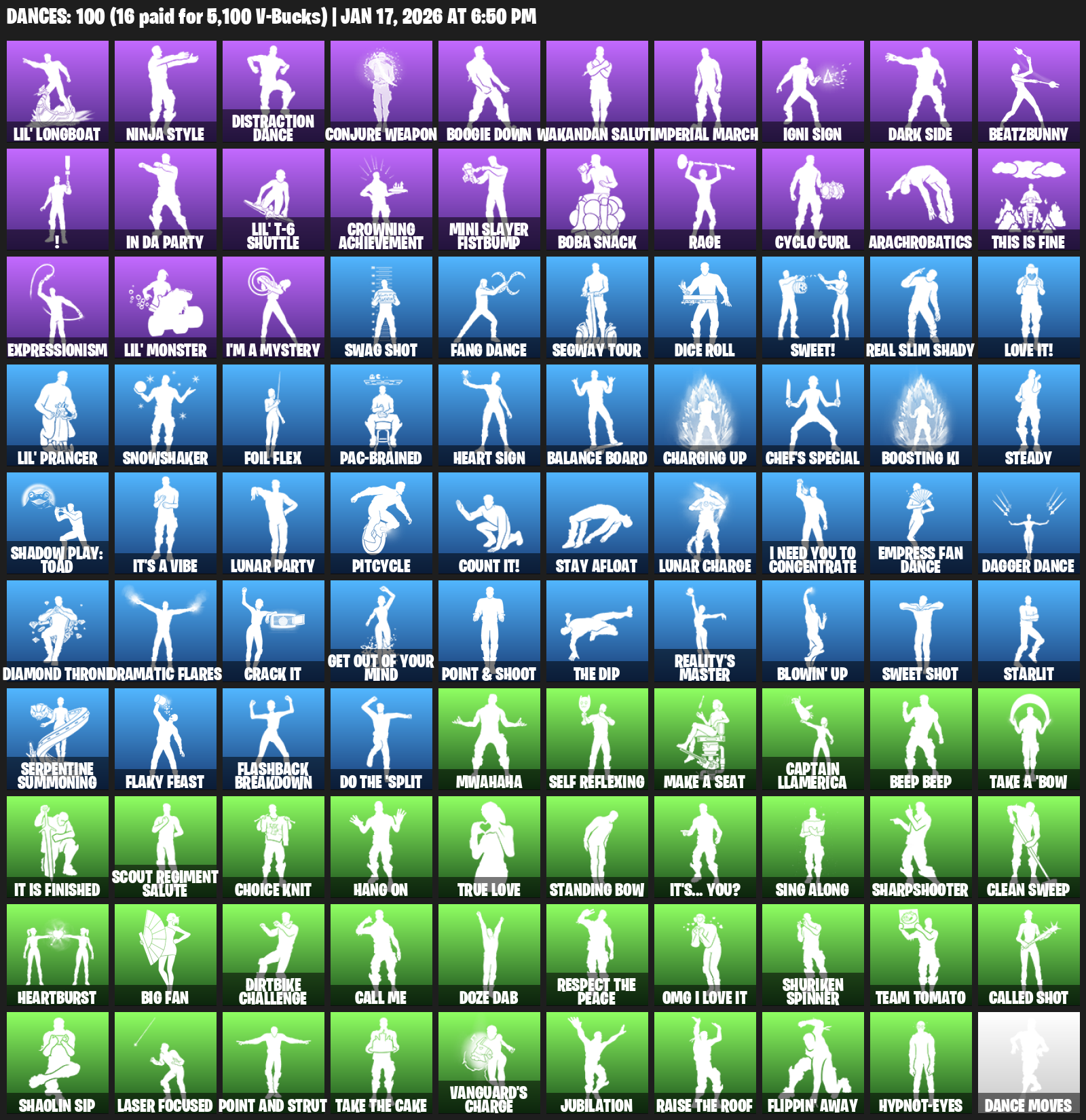 Lil’ Longboat, Ninja Style, Distraction Dance, Conjure Weapon, Boogie Down, Wakandan Salute, Imperial March, Igni Sign, Dark Side, BeatzBunny, !, In Da Party, Crowning Achievement, Mini Slayer Fistbump, Boba Snack, Rage, Cyclo Curl, Arachrobatics, This is Fine