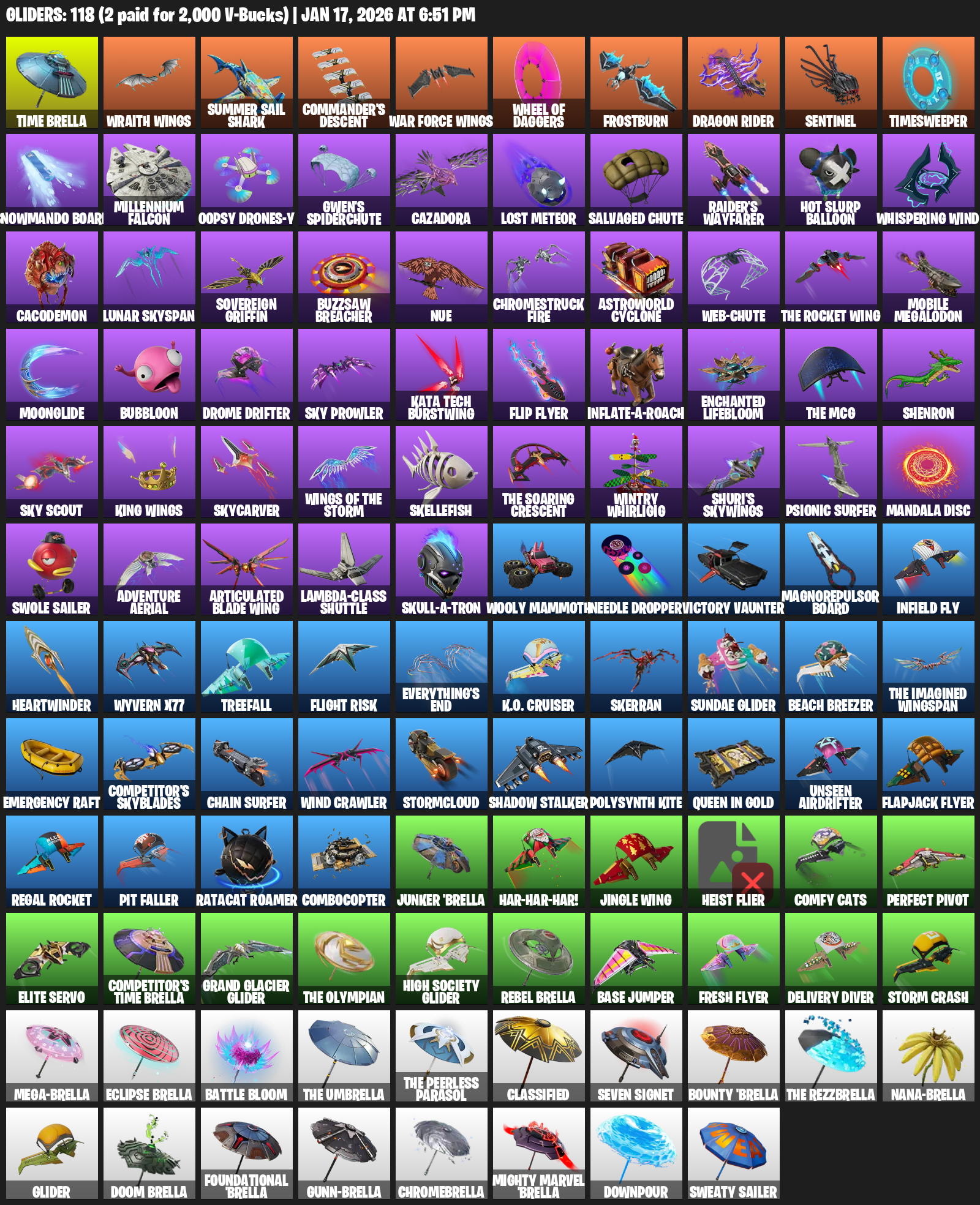 Time Brella, Wraith Wings, Summer Sail Shark, Commander’s Descent, Wheel of Daggers, Frostburn, Dragon Rider, Sentinel, Timesweeper, Snowmando Board, Millennium Falcon, Oopsy Drones-y, Gwen’s Spiderchute, Cazadora, Lost Meteor, Salvaged Chute, Raider’s Wayfarer, Hot Slurp Balloon, Whispering Wind