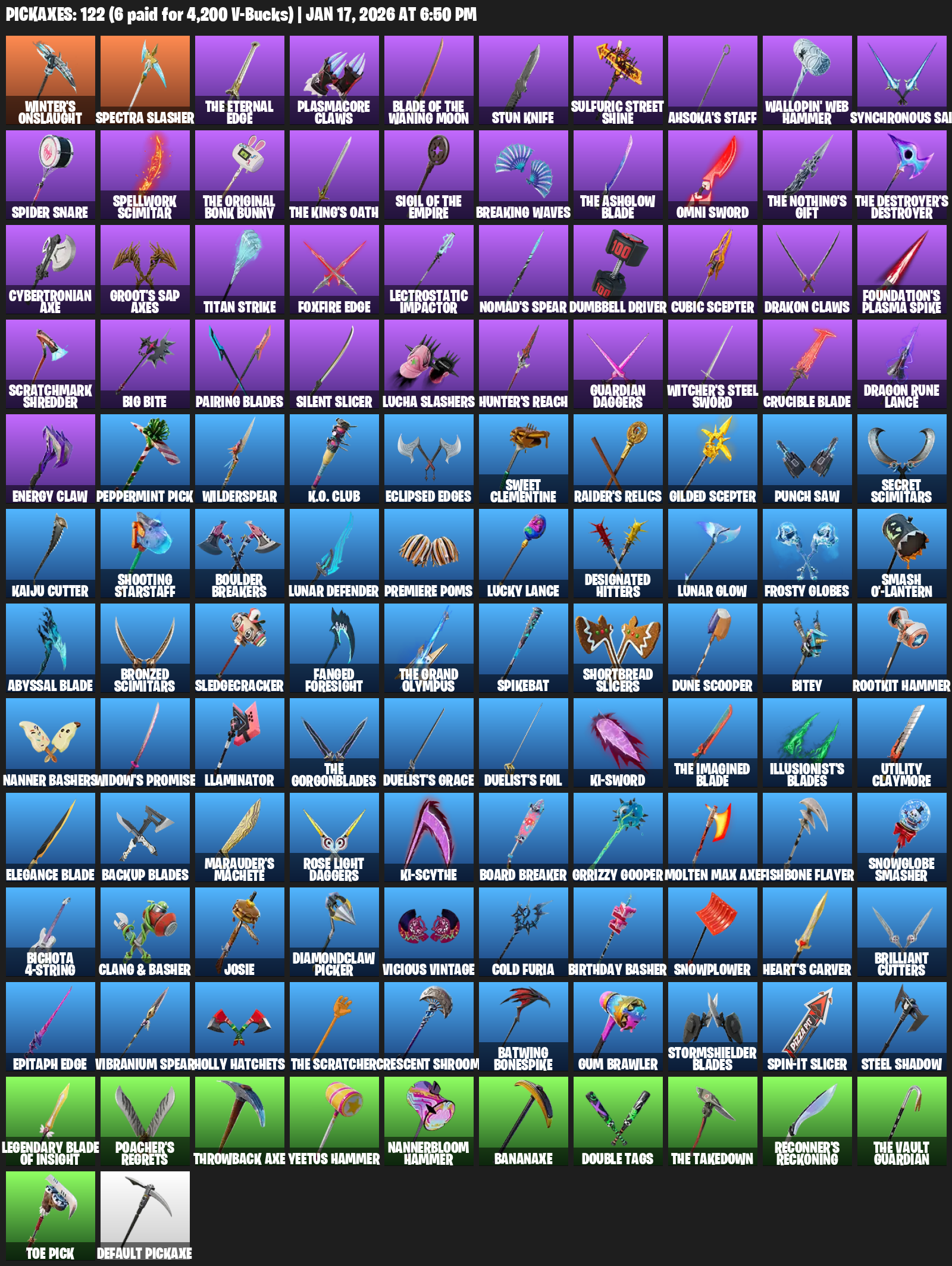 Winter’s Onslaught, Plasmacore Claws, Stun Knife, Sulfuric Street Shine, Ahsoka’s Staff, Wallopin’ Web Hammer, Synchronous Sai, Spider Snare, Spellwork Scimitar, Breaking Waves, Omni Sword