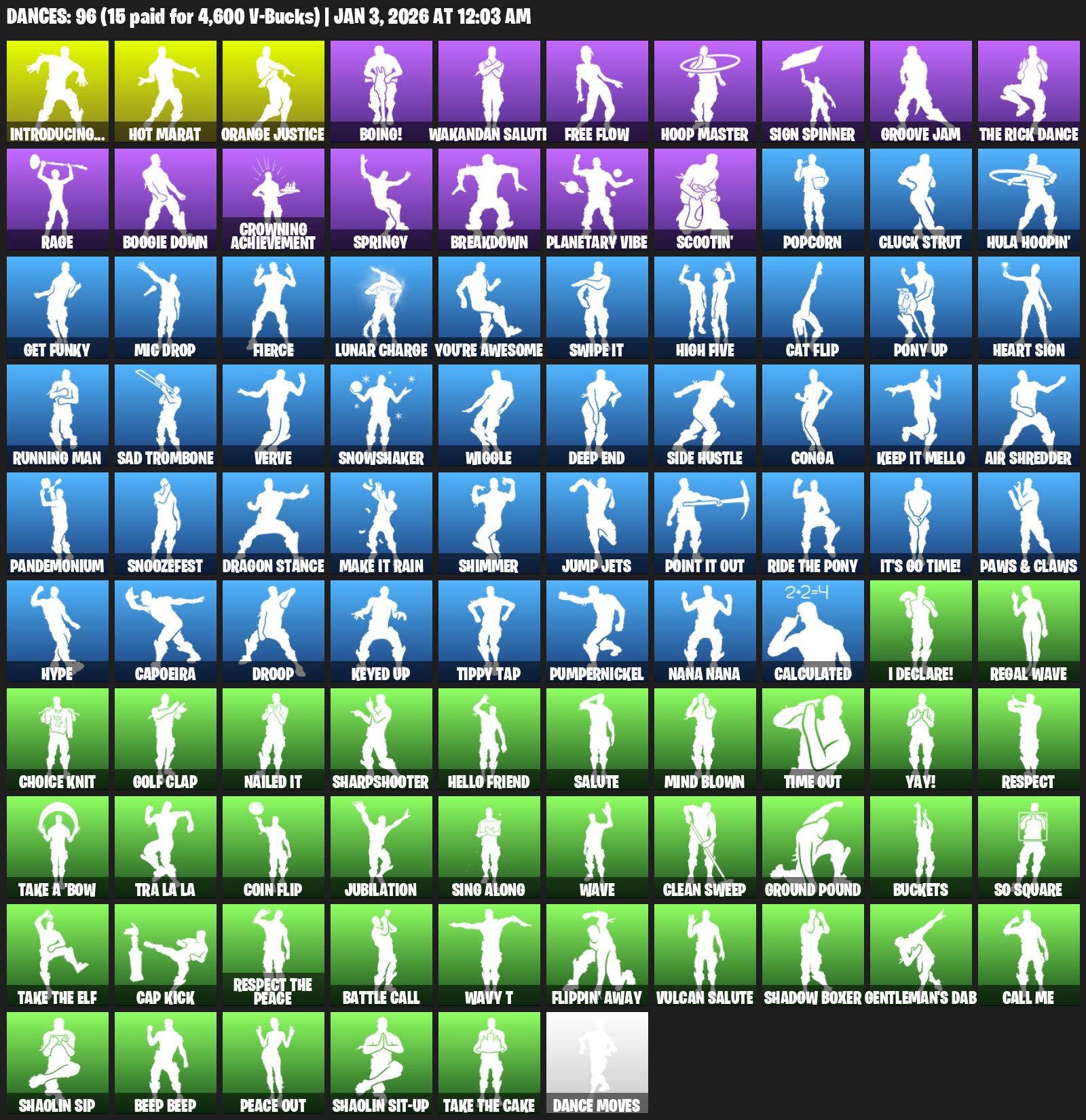 Introducing…, Hot Marat, Orange Justice, Boing!, Wakandan Salute, Free Flow, Hoop Master, Sign Spinner, Groove Jam, Rage, Boogie Down, Crowning Achievement, Springy, Breakdown, Planetary Vibe, Scootin’, Popcorn, Cluck Strut, Hula Hoopin’