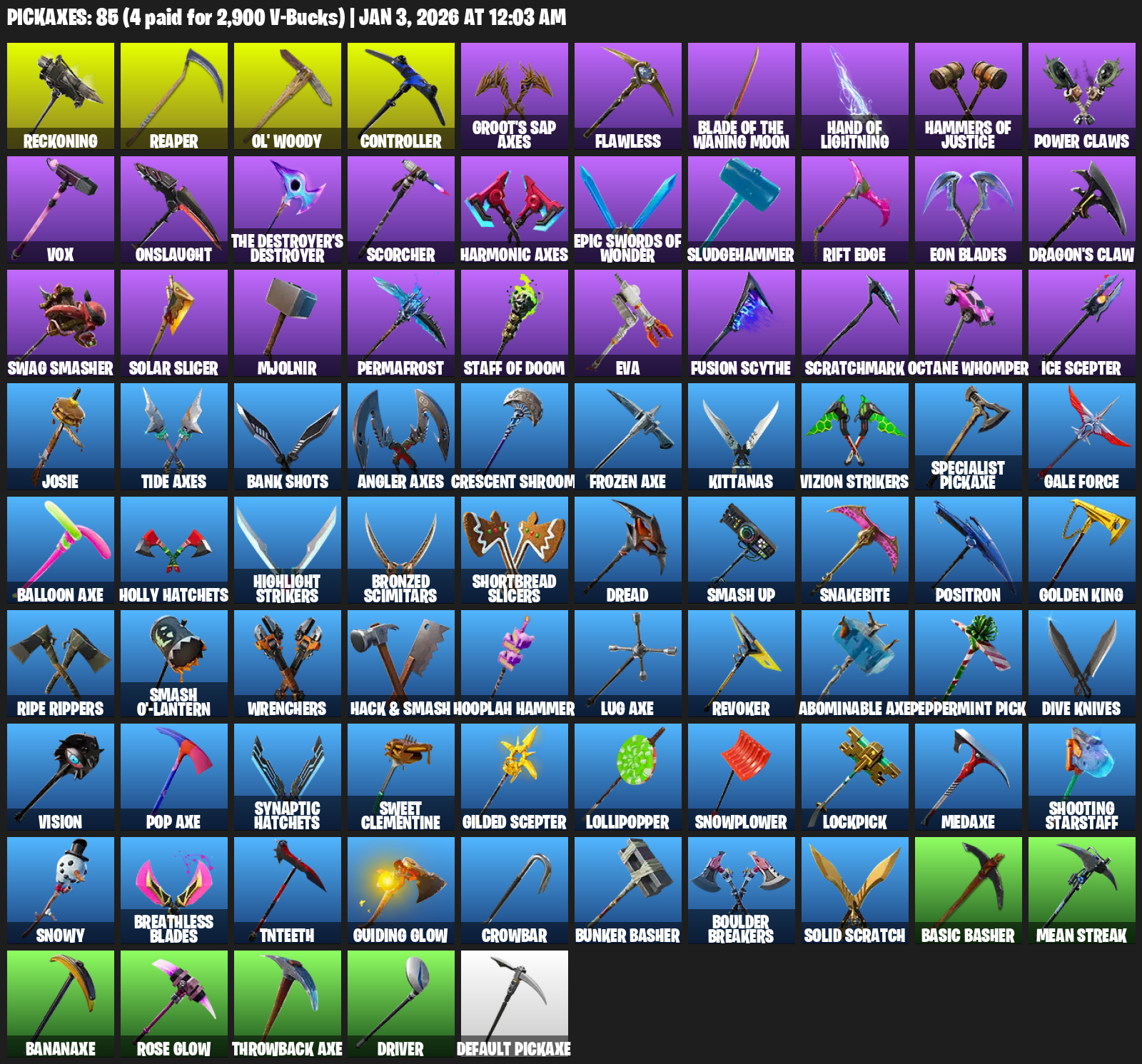 Reckoning, Reaper, Ol’ Woody, Controller, Groot’s Sap Axes, Flawless, Hand of Lightning, Power Claws, Vox, Onslaught, Scorcher, Sludgehammer, Rift Edge, Eon Blades, Dragon’s Claw