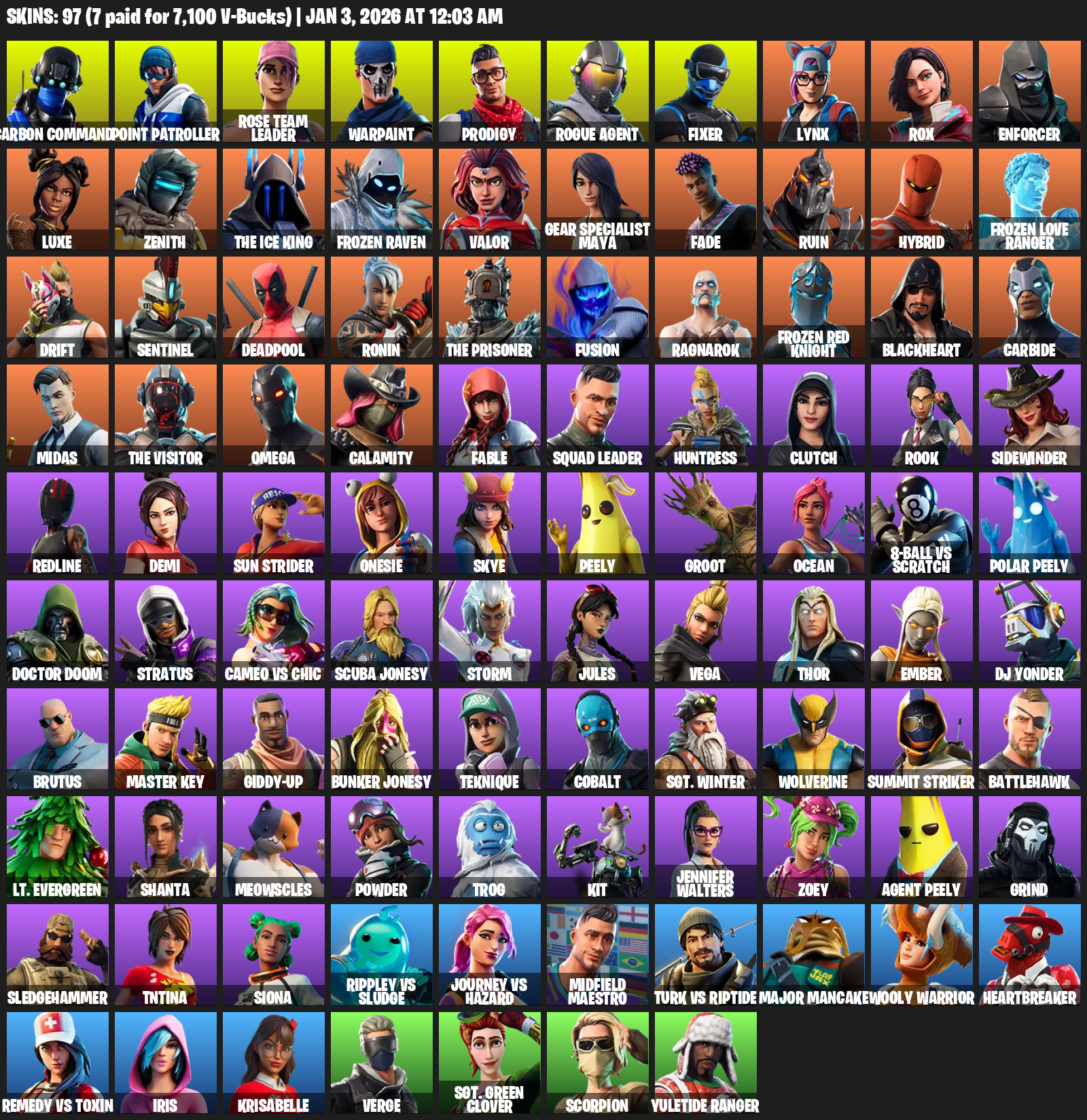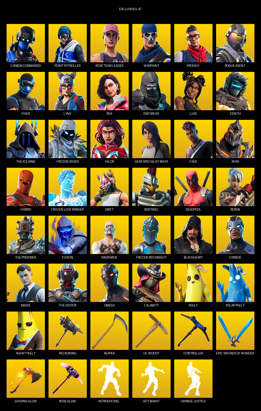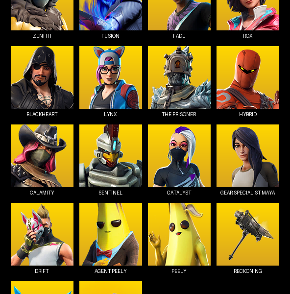 Point Patroller, Gear Specialist Maya, Omega, Carbon Commando, Rose Team Leader, Warpaint, Prodigy, Rogue Agent, Fixer, Lynx, Rox, Enforcer, Luxe, Zenith, The Ice King, Frozen Raven, Valor, Fade, Ruin, Hybrid