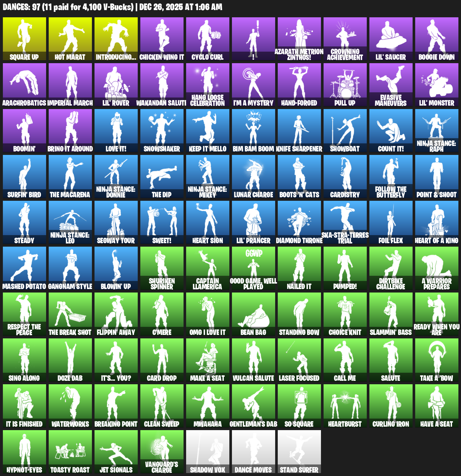 Hot Marat, Introducing…, Square Up, Chicken Wing It, Cyclo Curl, !, Azarath Metrion Zinthos!, Crowning Achievement, Lil’ Saucer, Boogie Down, Arachrobatics, Imperial March, Wakandan Salute, Hang Loose Celebration, I’m a Mystery, Hand-Forged, Evasive Maneuvers