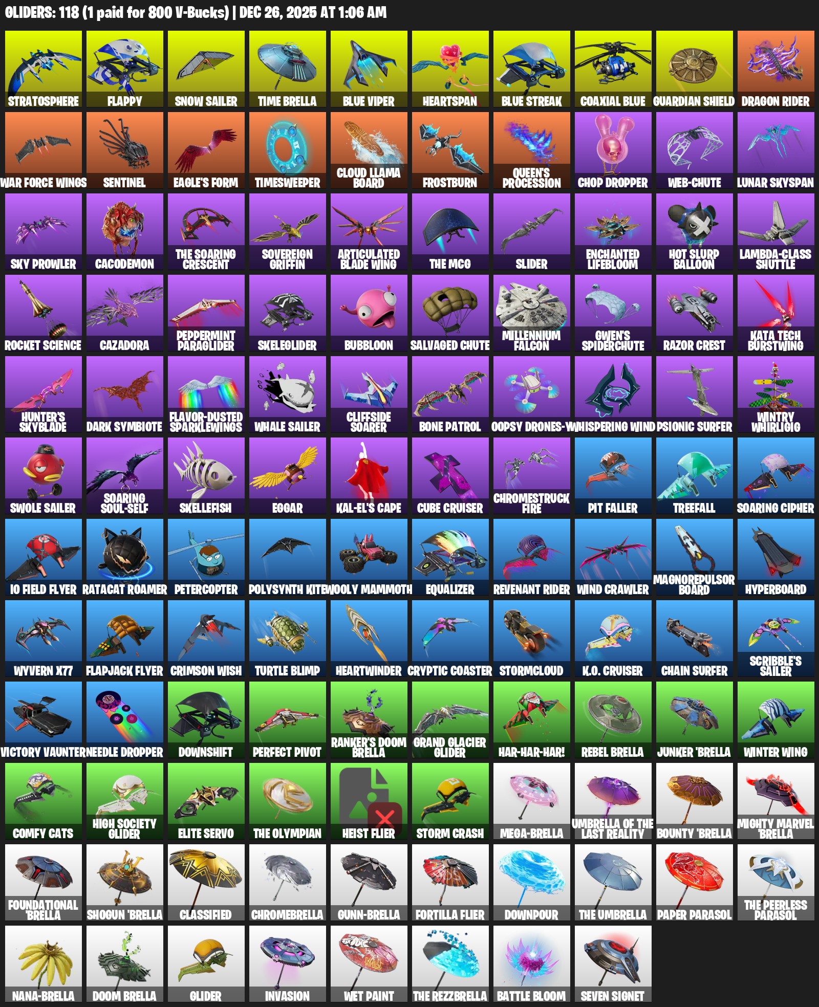 Stratosphere, Flappy, Snow Sailer, Time Brella, Heartspan, Guardian Shield, Dragon Rider, War Force Wings, Sentinel, Eagle’s Form, Timesweeper, Cloud Llama Board, Frostburn, Queen’s Procession, Chop Dropper, Web-Chute, Lunar Skyspan