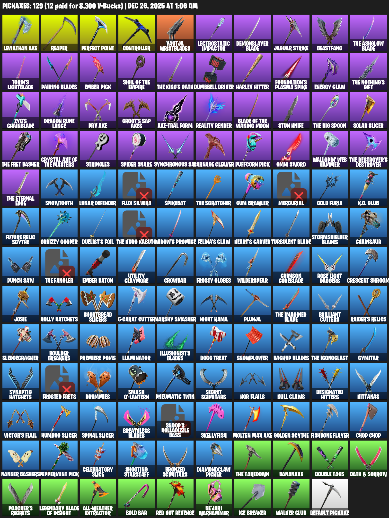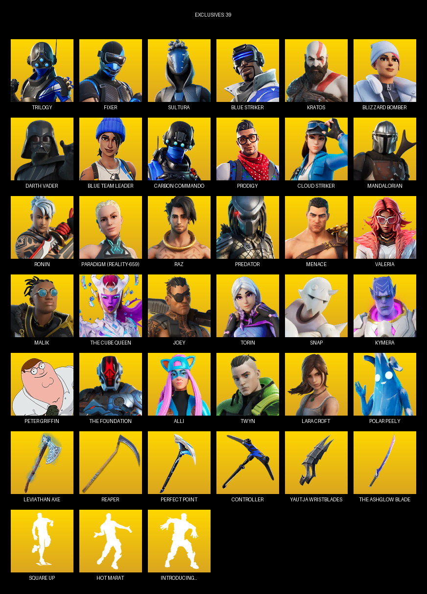 Leviathan Axe, Reaper, Perfect Point, Controller, Yautja Wristblades, Lectrostatic Impactor, Demonslayer Blade, Jaguar Strike, Beastfang, Torin’s Lightblade, Pairing Blades, Ember Pick, Sigil of the Empire, Dumbbell Driver, Harley Hitter, Foundation’s Plasma Spike, Energy Claw