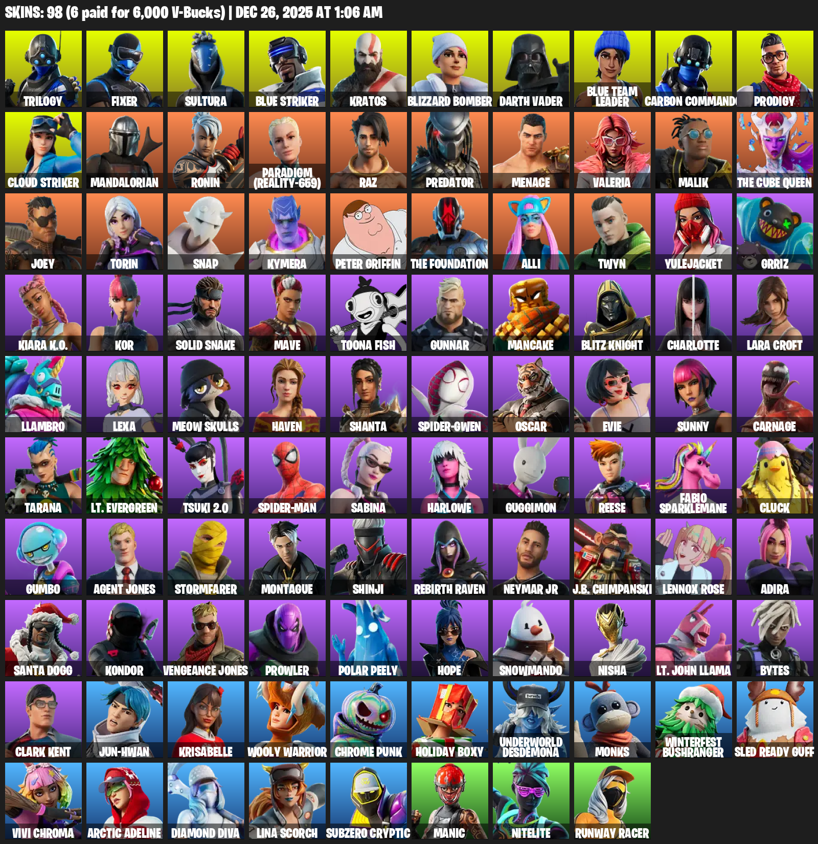 Lara Croft, Trilogy, Fixer, Sultura, Blue Striker, Kratos, Blizzard Bomber, Darth Vader, Carbon Commando, Prodigy, Mandalorian, Ronin, Paradigm (Reality-659), Raz, Predator, Menace, Valeria, Malik