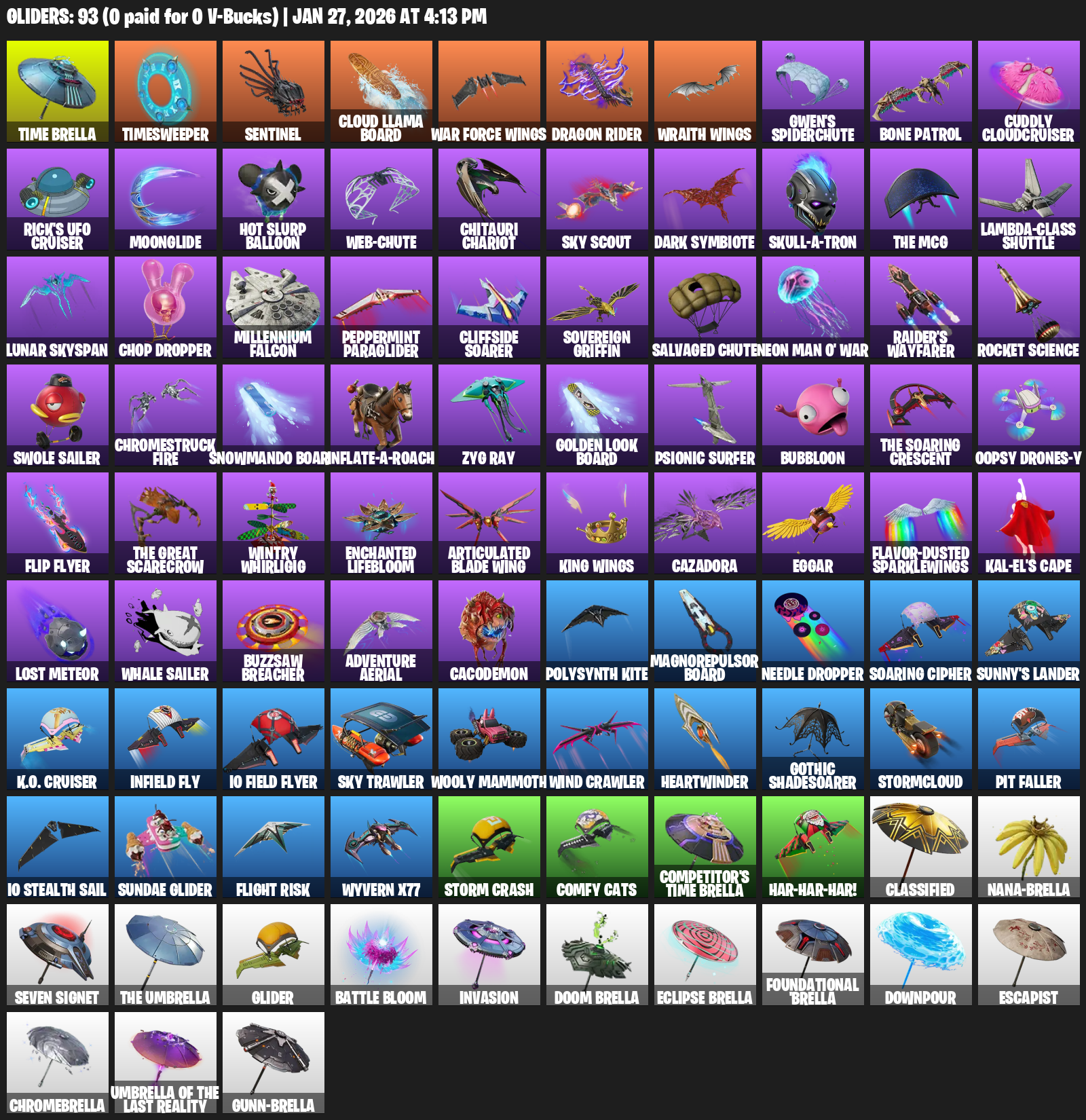 Time Brella, Timesweeper, Sentinel, Cloud Llama Board, War Force Wings, Dragon Rider, Gwen’s Spiderchute, Bone Patrol, Cuddly Cloudcruiser, Rick’s UFO Cruiser, Moonglide, Hot Slurp Balloon, Web-Chute, Chitauri Chariot, Sky Scout, Dark Symbiote, Skull-a-tron, Lambda-Class Shuttle