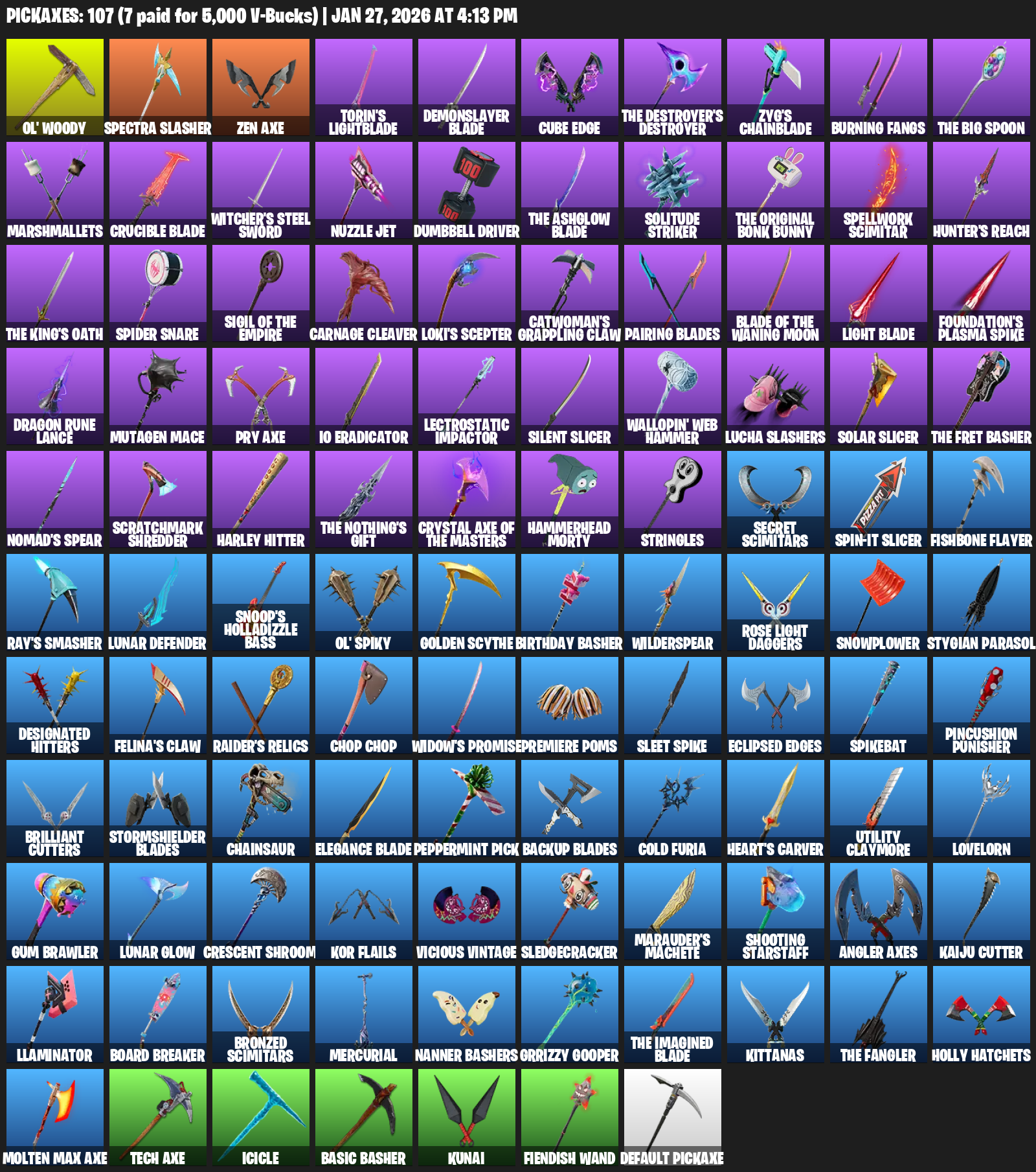 Ol’ Woody, Zen Axe, Torin’s Lightblade, Demonslayer Blade, Zyg’s Chainblade, Burning Fangs, Marshmallets, Witcher’s Steel Sword, Nuzzle Jet, Dumbbell Driver, Solitude Striker, Spellwork Scimitar, Hunter’s Reach