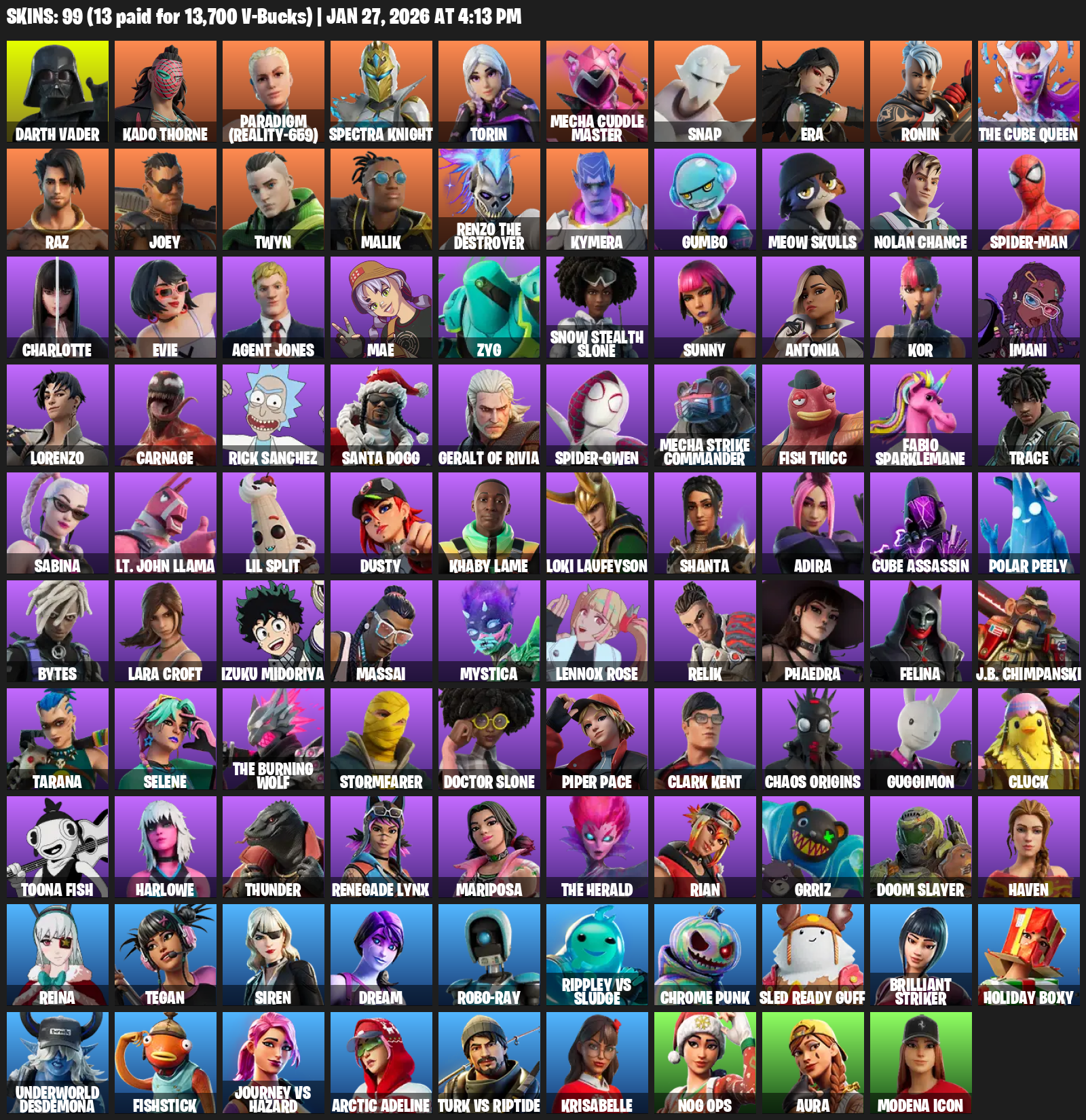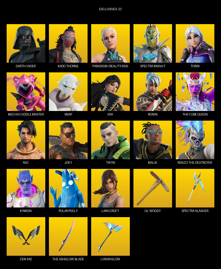 Lara Croft, Darth Vader, Kado Thorne, Paradigm (Reality-659), Spectra Knight, Torin, Mecha Cuddle Master, Snap, Era, Ronin, The Cube Queen, Raz, Joey, Twyn, Malik, Kymera, Gumbo, Meow Skulls, Nolan Chance