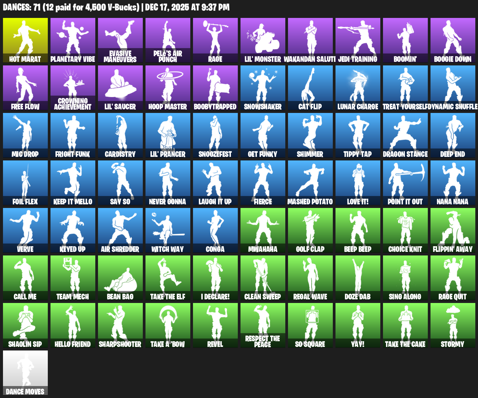 Hot Marat, Planetary Vibe, Evasive Maneuvers, Pelé’s Air Punch, Rage, Lil’ Monster, Wakandan Salute, Jedi Training, Boomin’, Boogie Down, Free Flow, Crowning Achievement, Hoop Master, Boobytrapped, Snowshaker, Cat Flip, Lunar Charge, Treat Yourself, Dynamic Shuffle