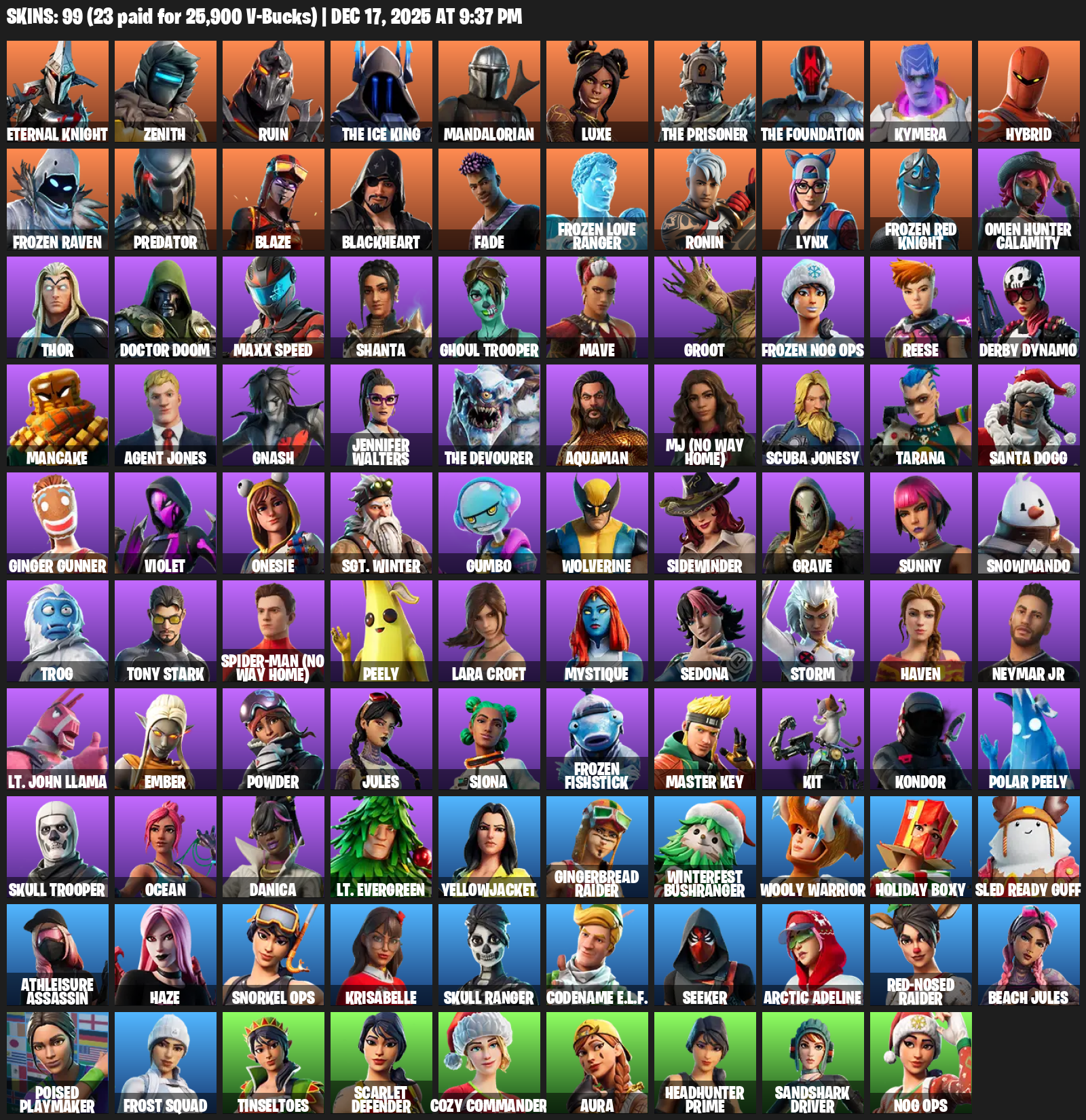 Lara Croft, Eternal Knight, Zenith, Ruin, The Ice King, Mandalorian, Luxe, Kymera, Hybrid, Frozen Raven, Predator, Blaze, Blackheart, Fade, Ronin, Lynx