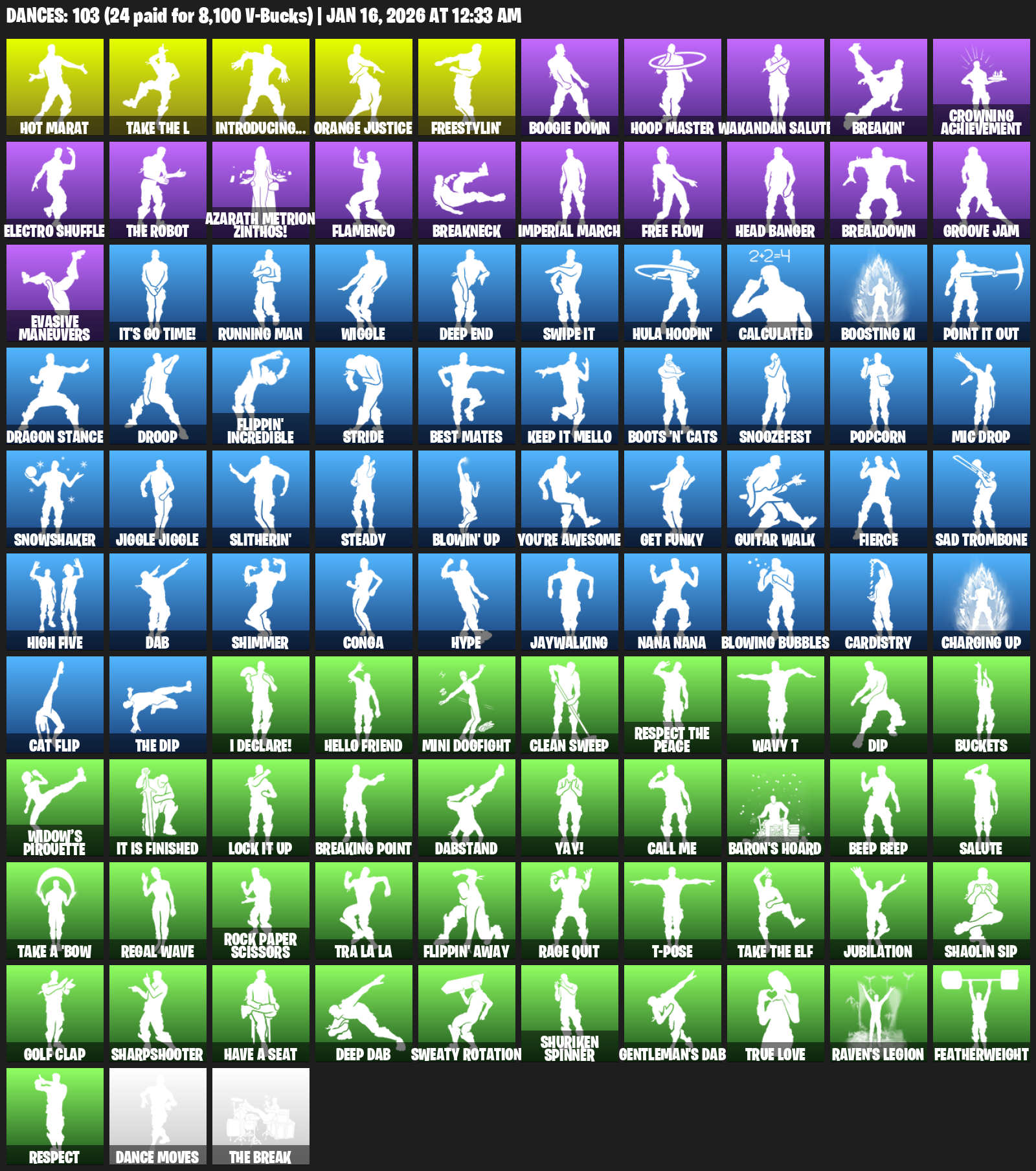 Hot Marat, Introducing…, Orange Justice, Freestylin’, Boogie Down, Hoop Master, Wakandan Salute, Breakin’, Crowning Achievement, Electro Shuffle, Azarath Metrion Zinthos!, Flamenco, Breakneck, Imperial March, Free Flow, Head Banger, Breakdown, Groove Jam