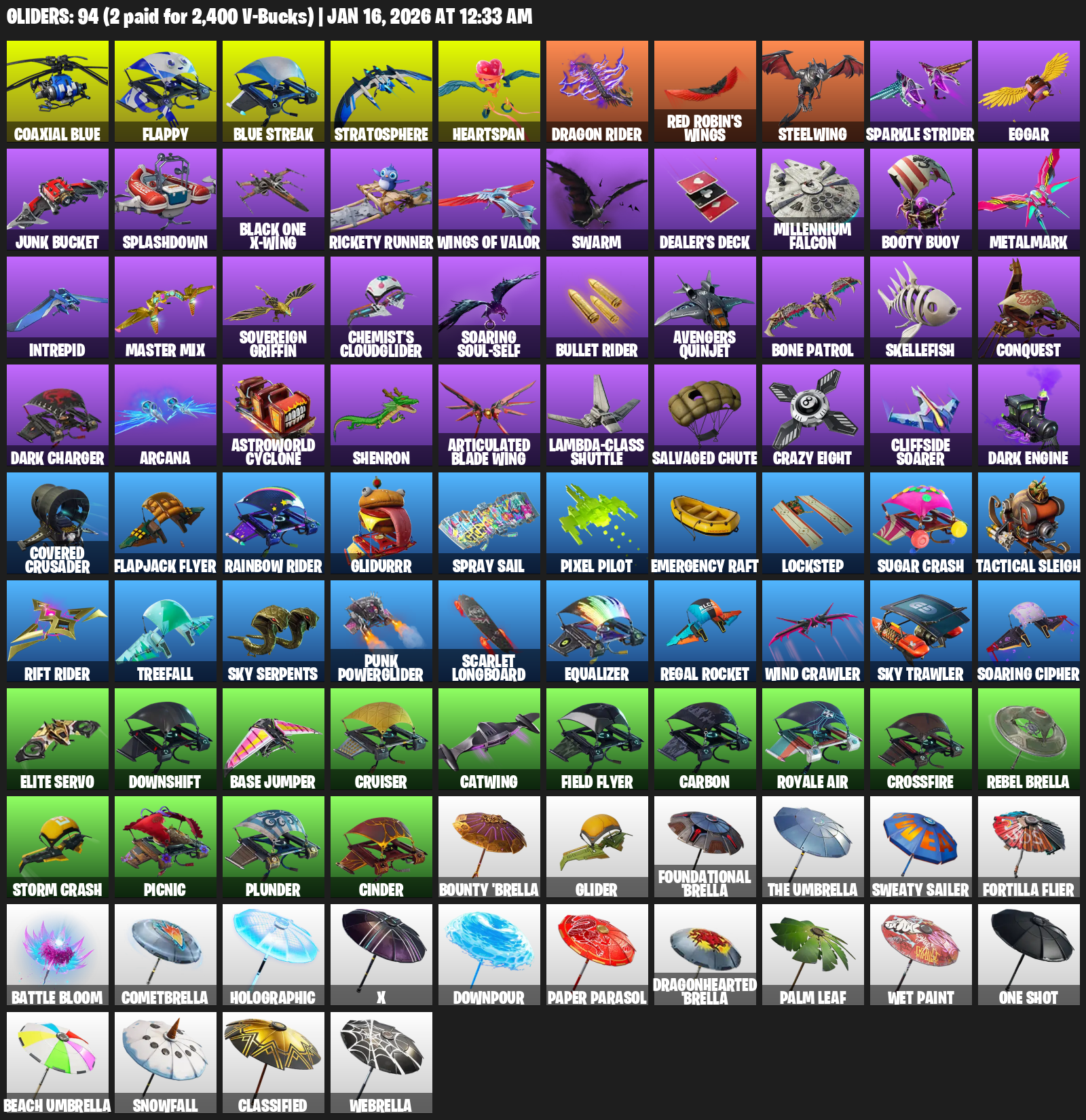 Flappy, Stratosphere, Heartspan, Dragon Rider, Red Robin’s Wings, Steelwing, Sparkle Strider, Eggar, Junk Bucket, Splashdown, Black One X-wing, Rickety Runner, Swarm, Dealer’s Deck, Millennium Falcon, Booty Buoy, Metalmark