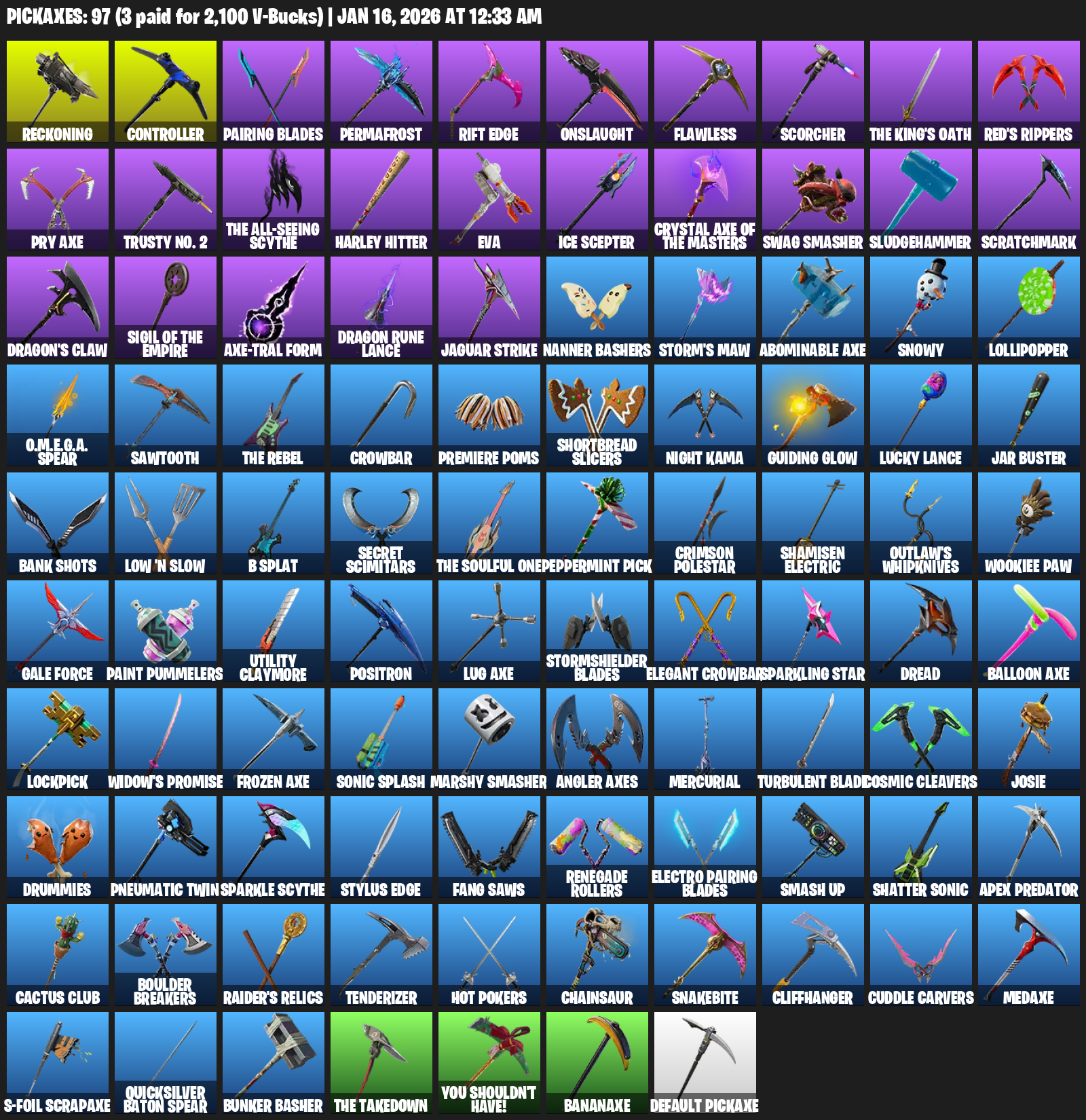 Reckoning, Controller, Pairing Blades, Permafrost, Rift Edge, Onslaught, Flawless, Scorcher, Red’s Rippers, Pry Axe, Trusty No. 2, Harley Hitter, EVA, Ice Scepter, Swag Smasher, Sludgehammer, Scratchmark