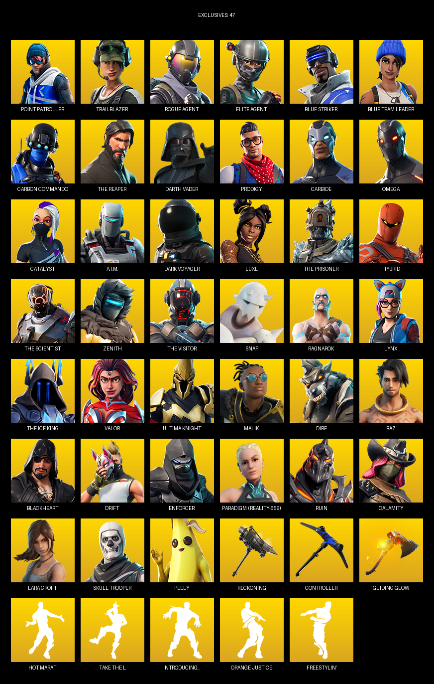 Point Patroller, Elite Agent, The Reaper, Omega, Lara Croft, Trailblazer, Blue Striker, Carbon Commando, Darth Vader, Prodigy, Carbide, Catalyst, A.I.M., Dark Voyager, Luxe, Hybrid