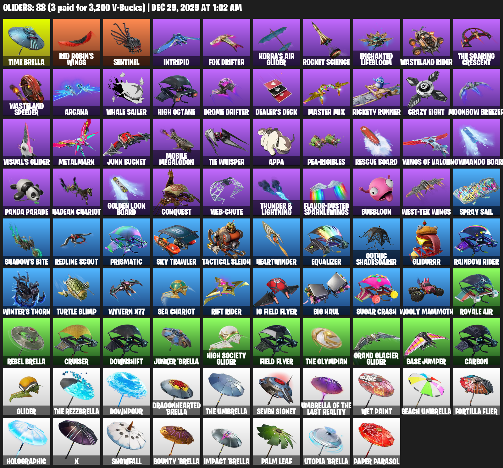 Time Brella, Red Robin’s Wings, Sentinel, Intrepid, Fox Drifter, Korra’s Air Glider, Rocket Science, Enchanted Lifebloom, Wasteland Rider, Arcana, Whale Sailer, High Octane, Dealer’s Deck, Master Mix, Rickety Runner, Crazy Eight, Moonbow Breezer