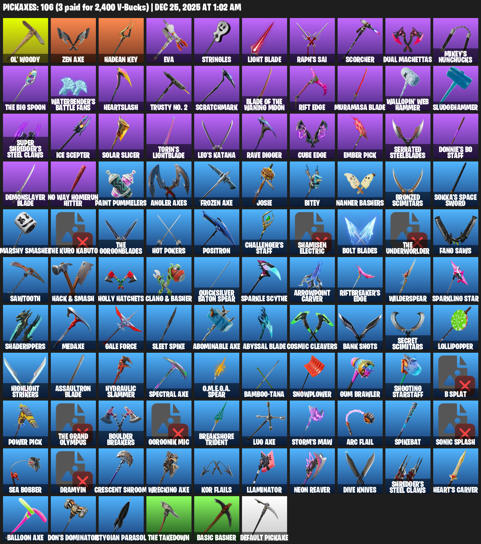 Ol’ Woody, Zen Axe, Hadean Key, EVA, Stringles, Light Blade, Raph’s Sai, Scorcher, Dual Machettas, Mikey’s Nunchucks, Waterbender’s Battle Fans, Heartslash, Trusty No. 2, Scratchmark, Rift Edge, Wallopin’ Web Hammer, Sludgehammer