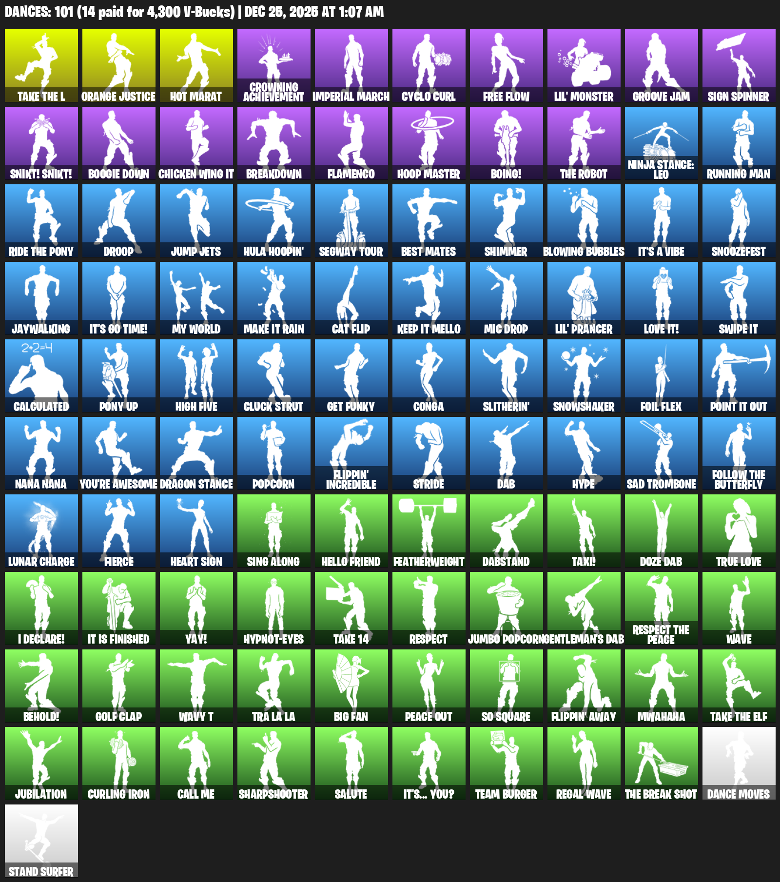 Hot Marat, Orange Justice, Crowning Achievement, Imperial March, Cyclo Curl, Free Flow, Lil’ Monster, Groove Jam, Sign Spinner, Snikt! Snikt!, Boogie Down, Chicken Wing It, Breakdown, Flamenco, Hoop Master, Boing!, Ninja Stance: Leo, Running Man
