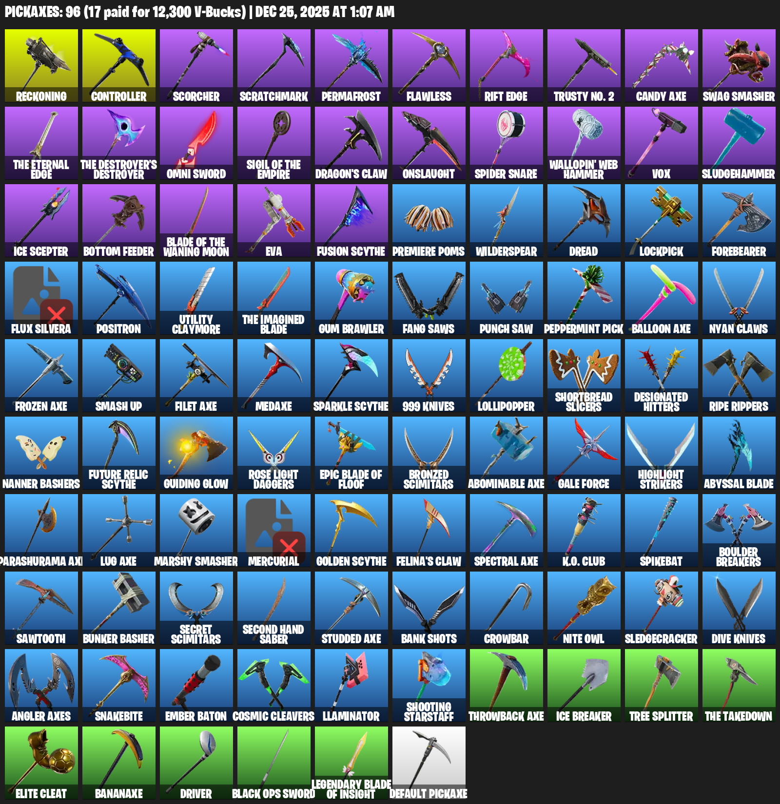 Reckoning, Controller, Scorcher, Scratchmark, Permafrost, Flawless, Rift Edge, Trusty No. 2, Candy Axe, Swag Smasher, Omni Sword, Dragon’s Claw, Onslaught, Spider Snare, Wallopin’ Web Hammer, Vox, Sludgehammer