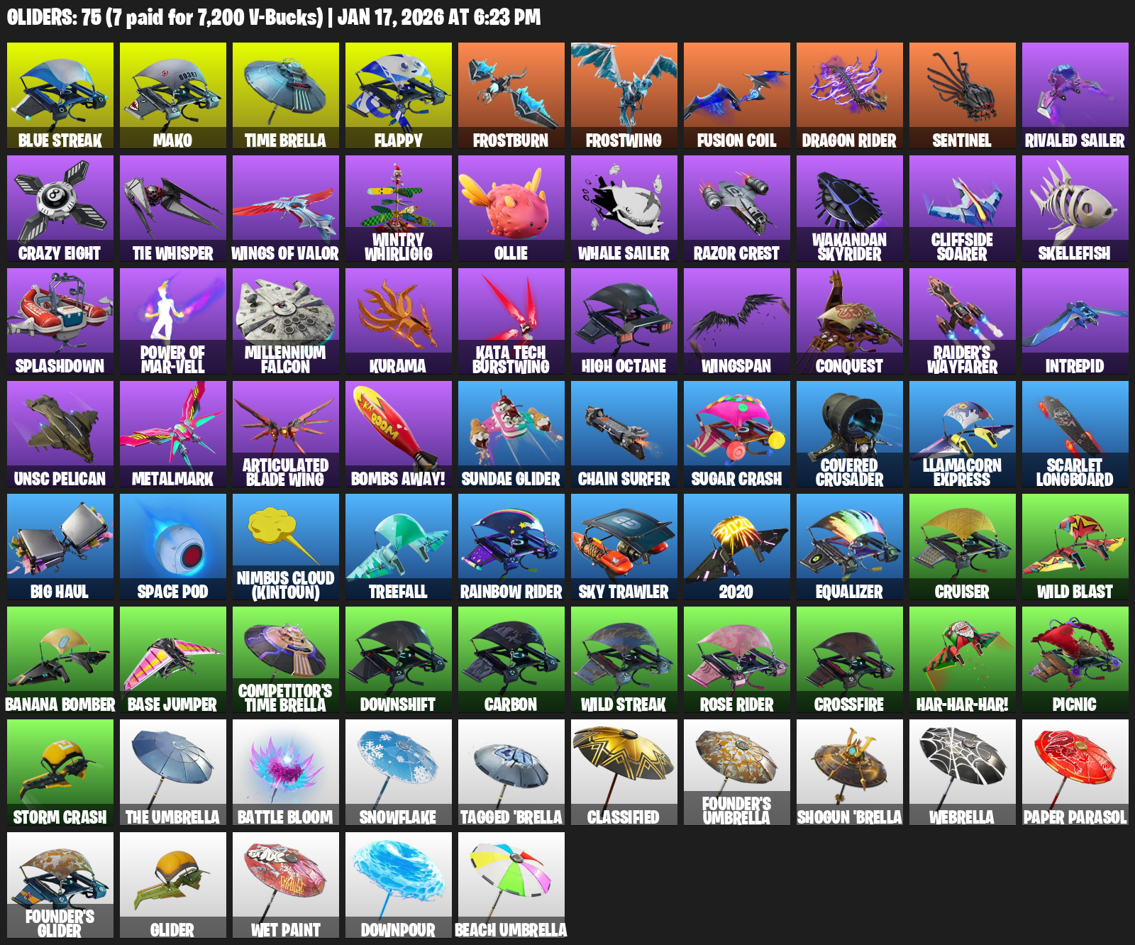 Mako, Time Brella, Flappy, Frostburn, Frostwing, Fusion Coil, Sentinel, Rivaled Sailer, Crazy Eight, TIE Whisper, Wings of Valor, Wintry Whirligig, Ollie, Razor Crest, Wakandan Skyrider, Cliffside Soarer, Skellefish