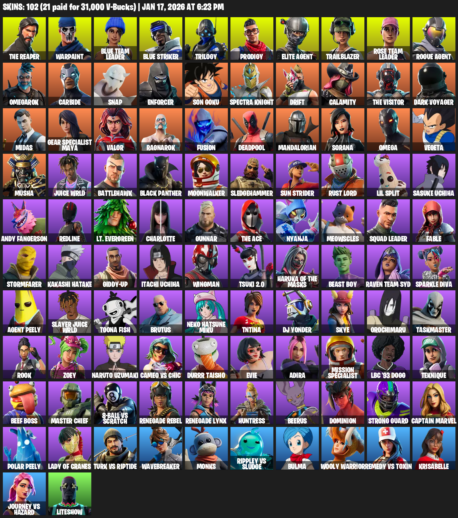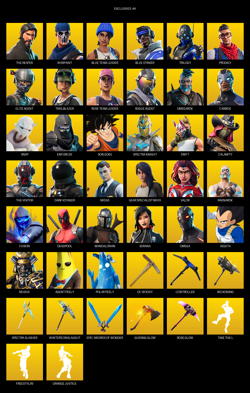 The Reaper, Elite Agent, Gear Specialist Maya, Omega, Warpaint, Blue Team Leader, Trilogy, Prodigy, Trailblazer, Omegarok, Carbide, Snap, Enforcer, Son Goku, Spectra Knight, Drift, Calamity